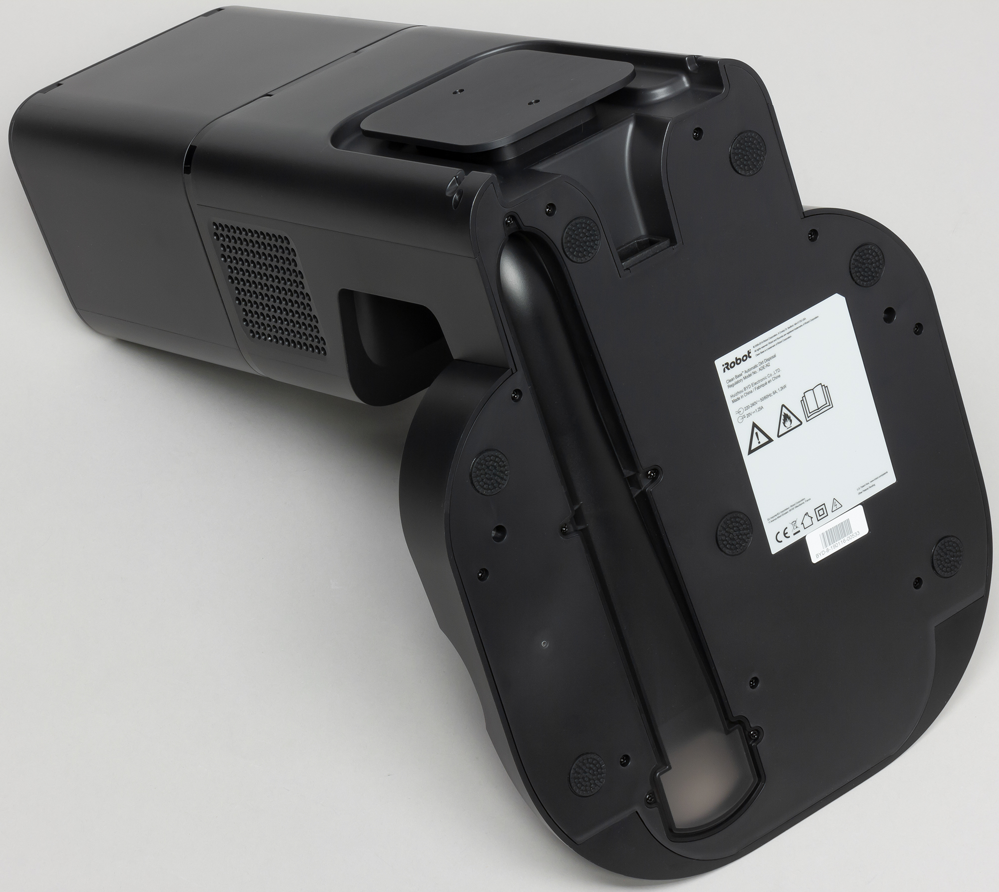 База имеет отсоединяемый кабель питания (длиной 1,8 м) со стандартным разъемом IEC C17. Излишки кабеля можно уложить в отсек сзади на базе. Выводится кабель через углубления на правую или на левую сторону базы. Кожух воздуховода на днище базы полупрозрачный и съемный, что позволяет увидеть место засора и почистить воздуховод, при необходимости сняв кожух. Снизу на основание базы приклеено несколько рельефных резиновых площадок, в итоге база хорошо цепляется за пол с самой разнообразной поверхностью.
