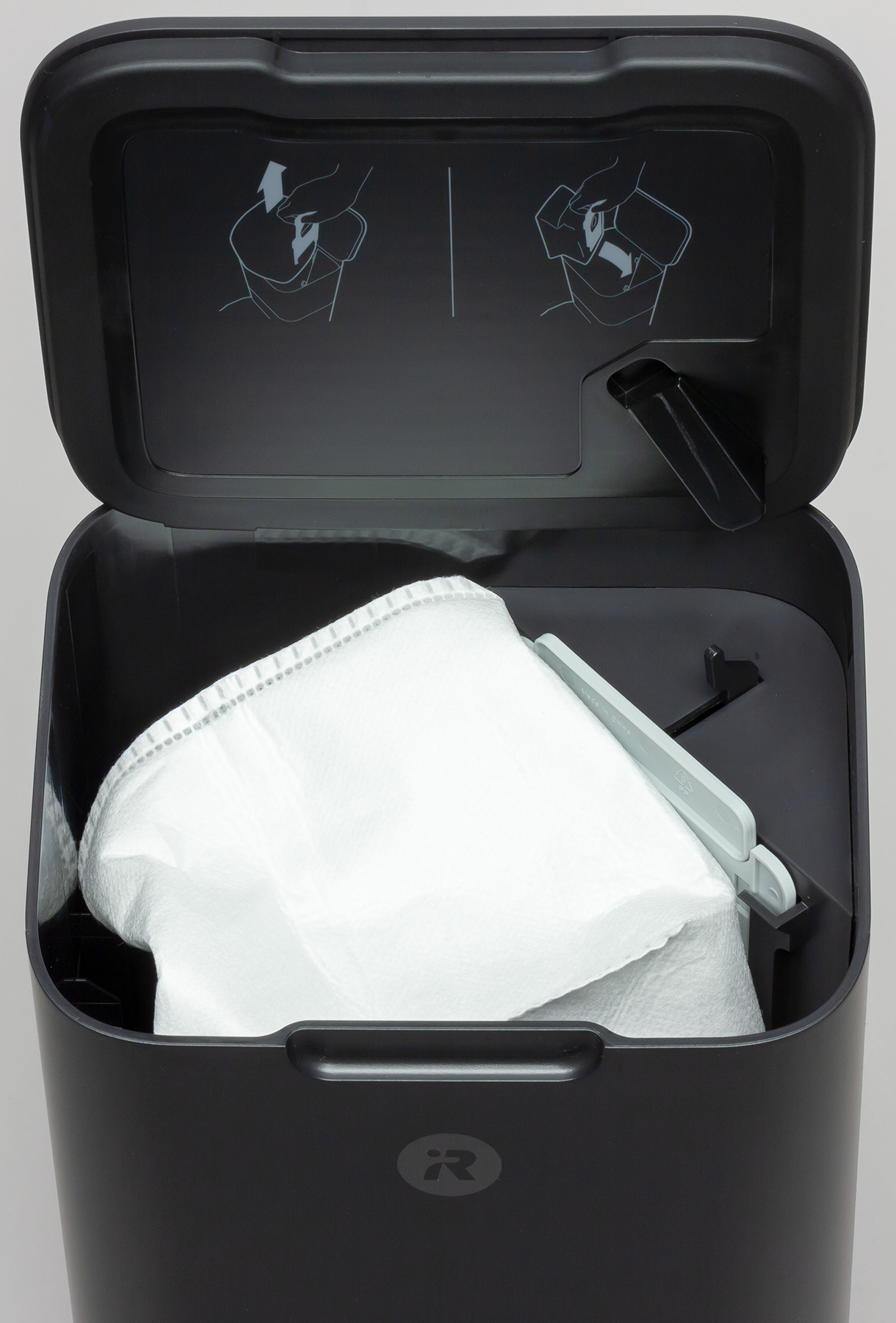 Воздуховод ведет в верхний отсек базы, где находится одноразовый мешок для мусора. Отсек закрывает крышка с уплотнением по периметру.