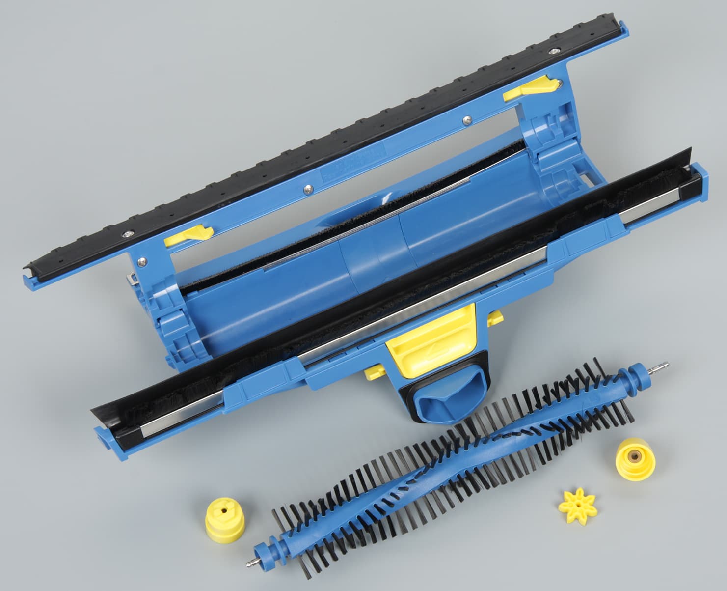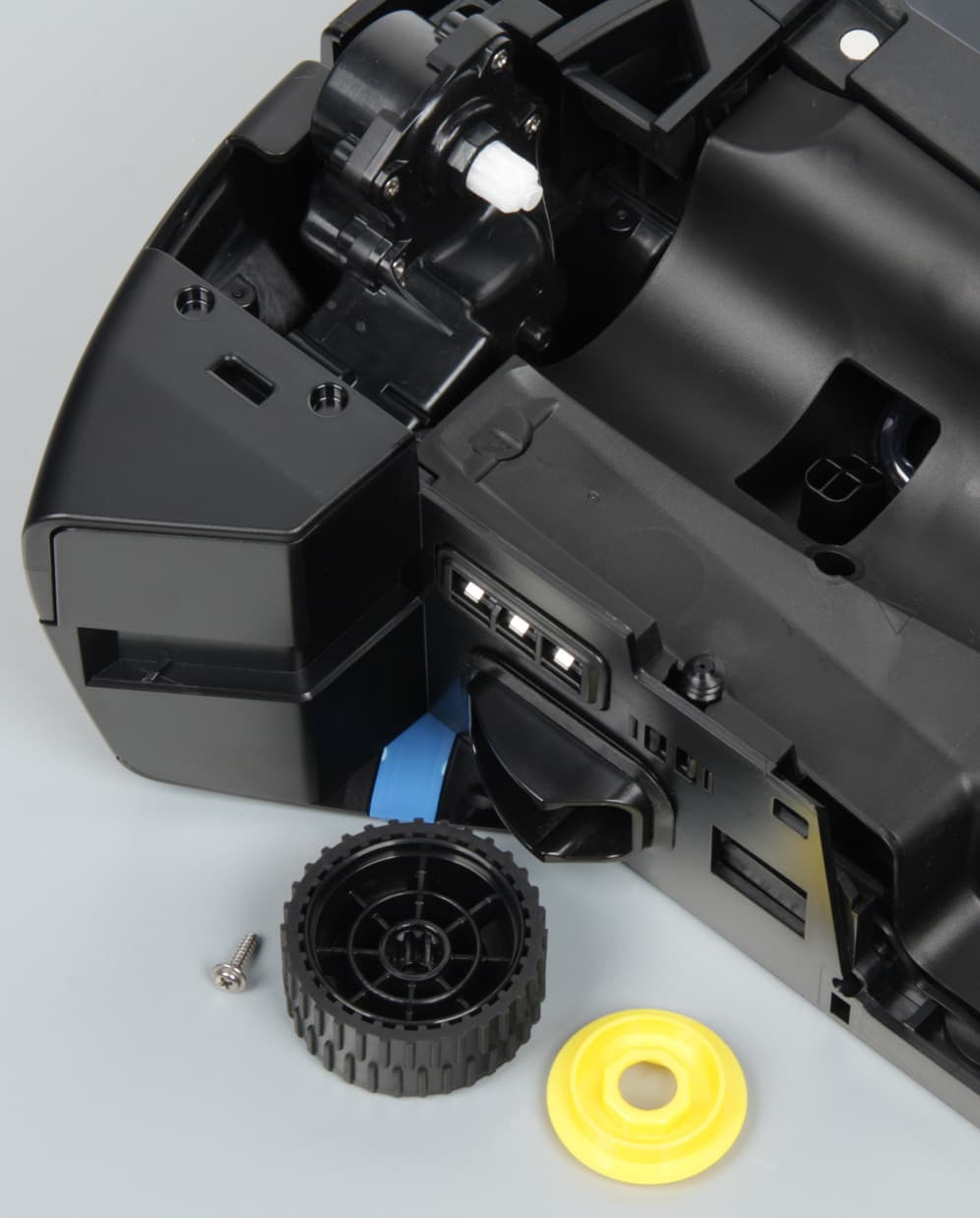 Вообще, все части робота, требующие повышенного внимания со стороны пользователя, обозначены метками желтого цвета. Кроме сетчатого фильтра, это фиксаторы чистящего блока, приводная шестеренка и подшипники щетки: