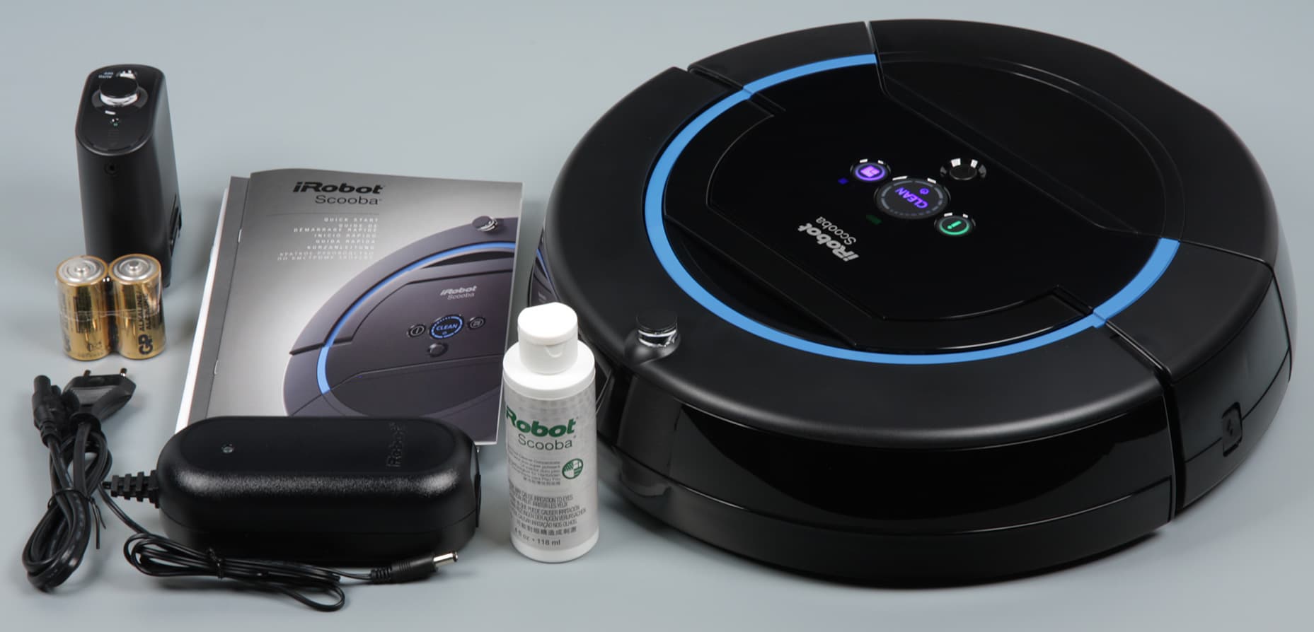 Эта модель Scooba теперь комплектуется стандартным для роботов-пылесосов iRobot Roomba блоком питания (в варианте, где он не совмещен с базой), и разъем питания на боку Scooba тоже такой же — удобный коаксиальный, не требующий соблюдения ориентации как в прошлой версии моющего робота от iRobot. Комплект поставки состоит из: собственно робота, виртуальной стены с элементами питания, документации (краткое и полное руководство) и флакона с концентратом фирменного моющего средства.