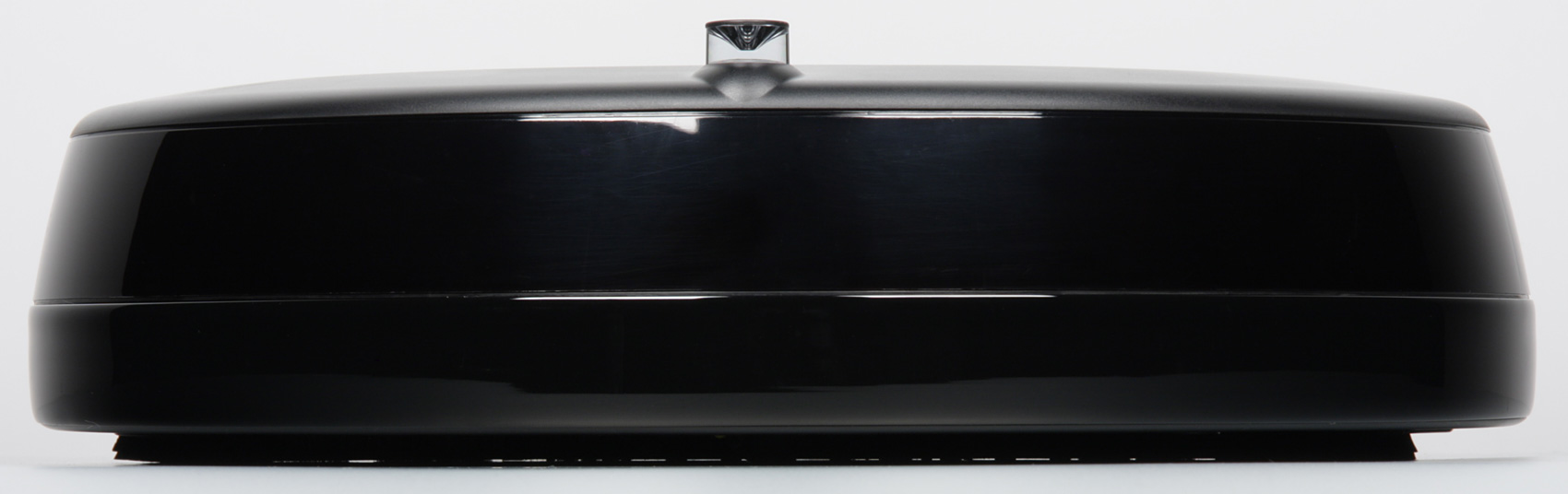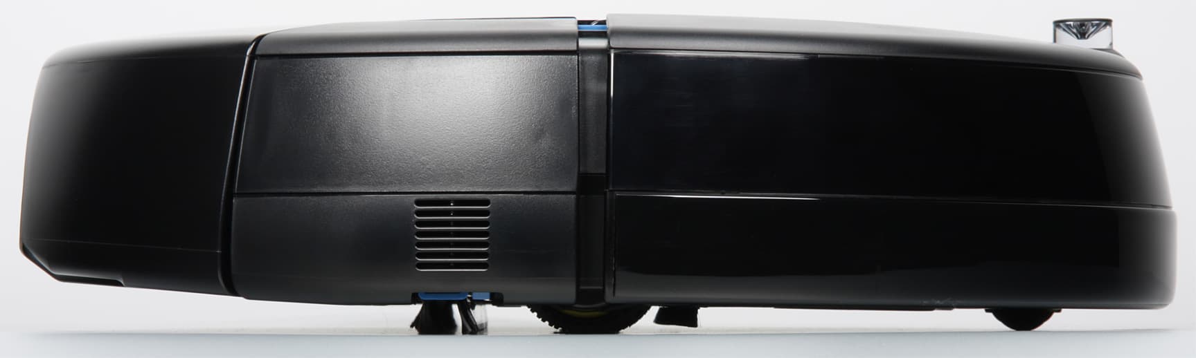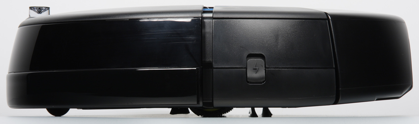 Этот датчик является самой верхней точкой пылесоса, и именно он определяет минимальную высоту просвета предметов обстановки, под которые пылесос еще может забраться. На левом боку можно увидеть прикрытый резиновой заглушкой разъем питания.