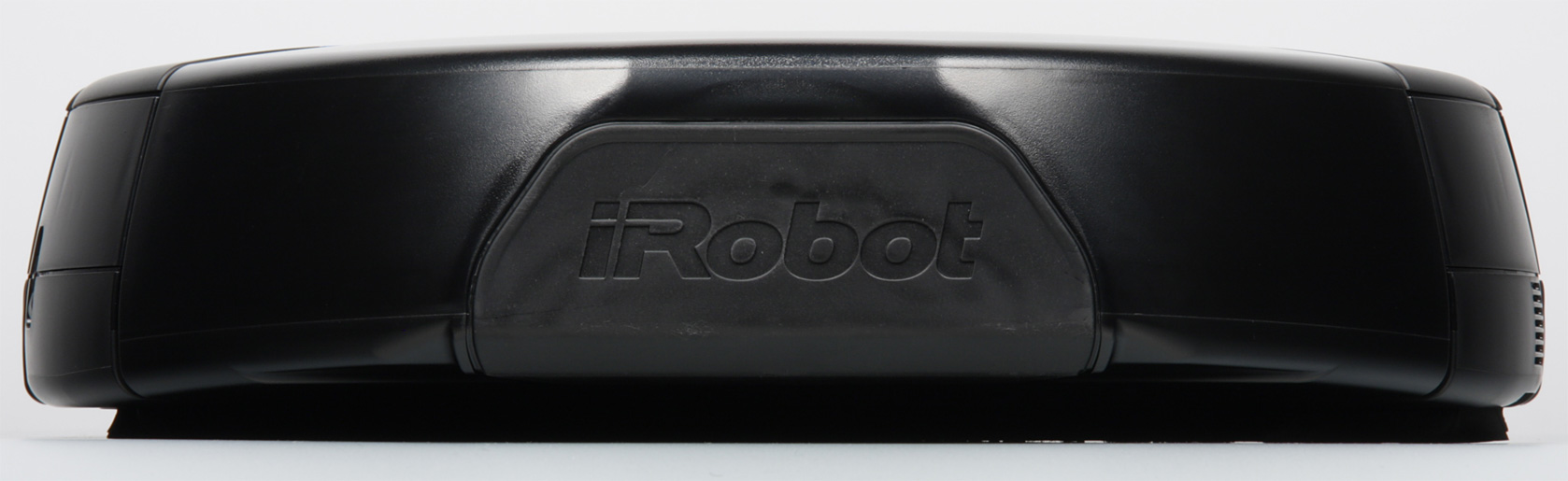 Опорный ролик на подпружиненной стойке, две контактные площадки, используемые для подзарядки робота на опциональной базе-сушилке, крышку отсека аккумулятора, фиксирующуюся двумя воротками, голубой чистящий блок с щетками и скребками, два ведущих колеса на подпружиненных рычагах и днище бака. На бампере в четырех местах ближе к краю за вытянутыми прямоугольными окошками размещены ИК-датчики перепада высоты. Конструкция опорного ролика позволяет роботу определять его вывешивание, но вращение ролика, видимо, не отслеживается. На ролик надета гладкая резиновая покрышка.