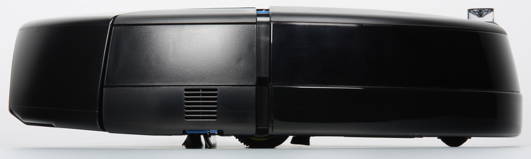 Оси ведущих колес расположены на диаметре окружности корпуса. Такая кинематическая схема позволяет роботу совершать разворот на месте без изменения границ, занимаемой роботом площади, поэтому пылесос отличается хорошей маневренностью. На ведущих колесиках установлены резиновые покрышки с неглубокими грунтозацепами. Диаметр ведущих колес небольшой (44 мм), как и ход шарниров (15 мм), на которых закреплены колеса, поэтому робот обладает относительно низкой проходимостью, и должен эксплуатироваться на ровных поверхностях. В данном случае неспособность робота преодолевать препятствия можно использовать для ограничения площади, на которой нужно проводить влажную уборку. Также робот не будет пытаться забираться на коврики и половички — он их все равно не может эффективно очищать. Наши измерения габаритов и веса пылесоса дали следующие значения: ширина 372 мм, глубина 361 мм, высота 100 мм, вес 4,2 кг