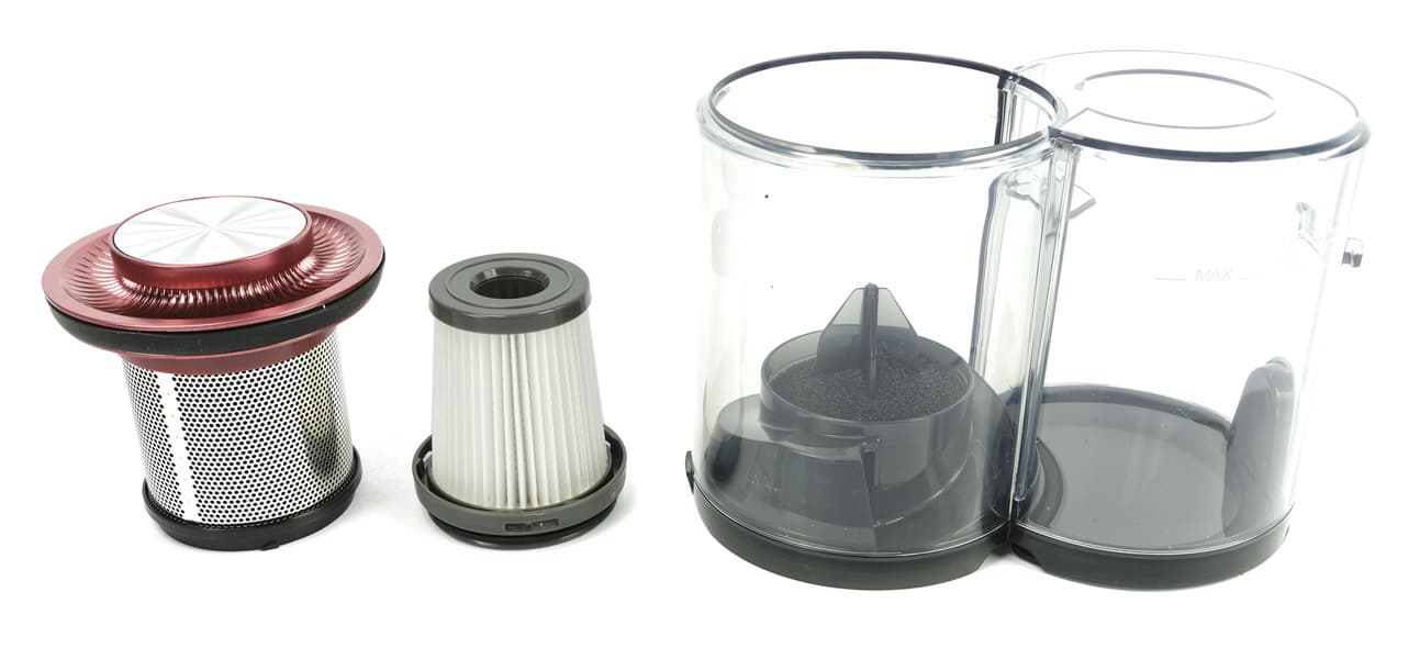 Контейнер для пыли состоит из двух цилиндров. Поток воздуха с загрязнениями попадает в отсек с циклонным фильтром, где закручивается вокруг центрального элемента.