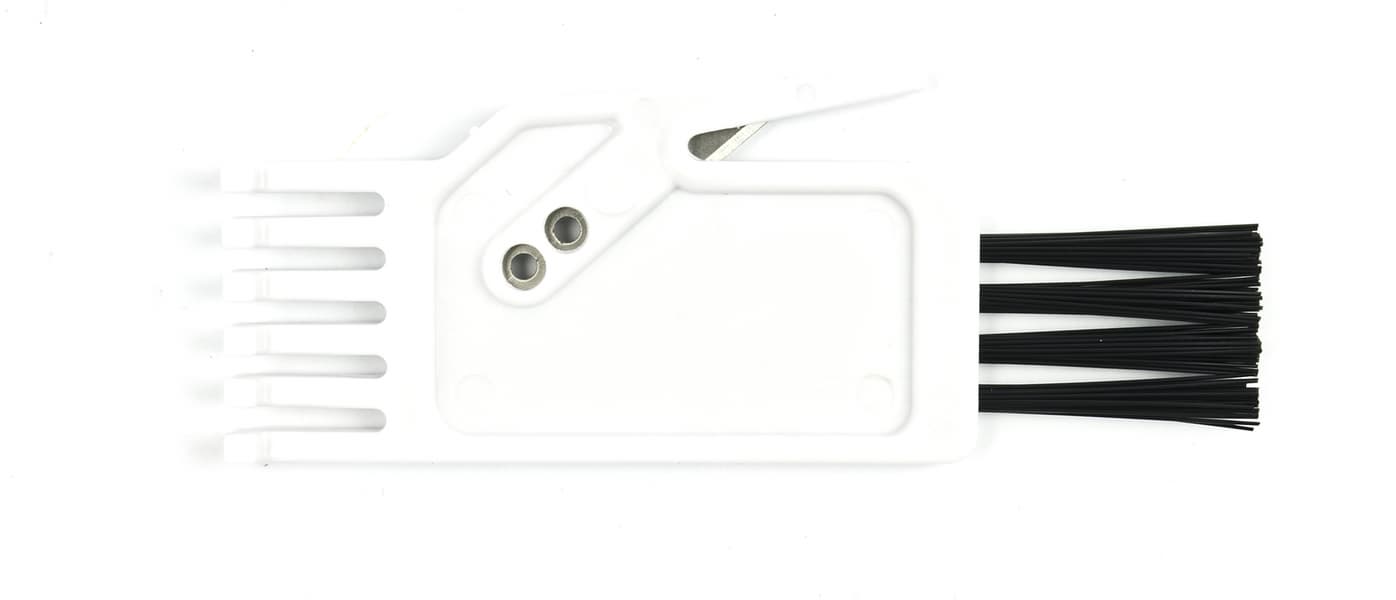 К пылесосу прилагается также несложное приспособление для чистки. Оно состоит из щетки, гребенки для «прочесывания» HEPA-элемента и лезвия, которым удобно срезать с ротора намотавшихся на него волосы и нитки.