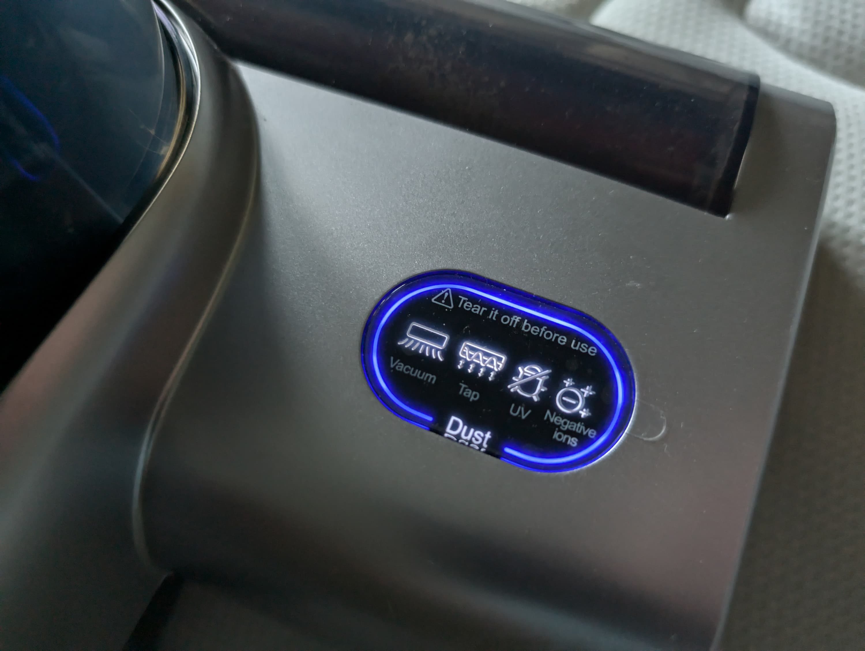Небольшой овальный дисплей на верхней панели отображает выбранную мощность и активные функции (всасывание, чистку, УФ-обработку и ионизацию).