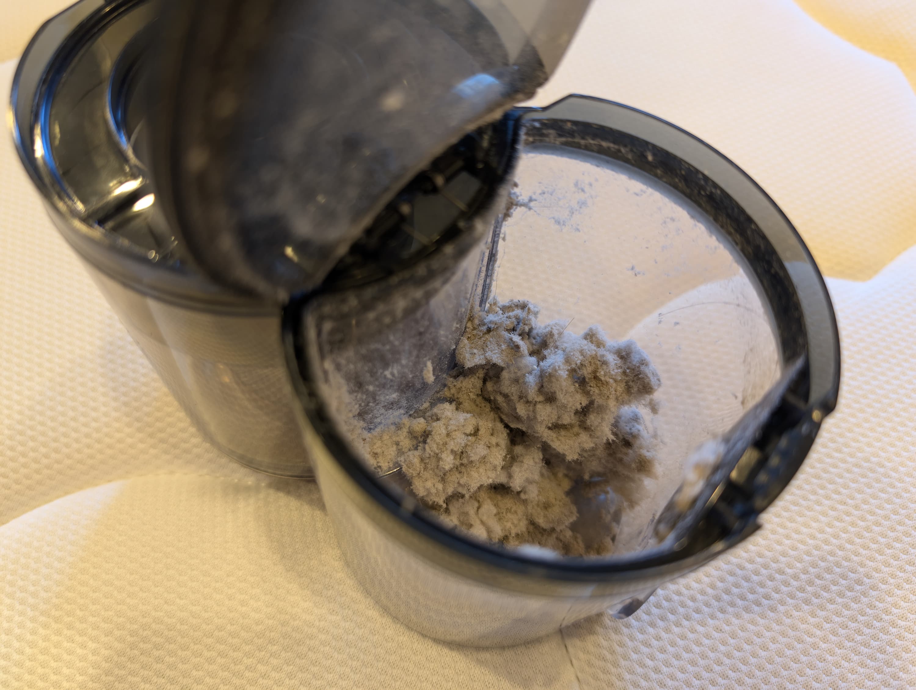 После применения пылесоса на наших чистых на вид двуспальном матрасе, двух подушках и одеяле мы были крайне удивлены содержимым контейнера для пыли. Посмотрите на фотографию — и вы поймете наши чувства.