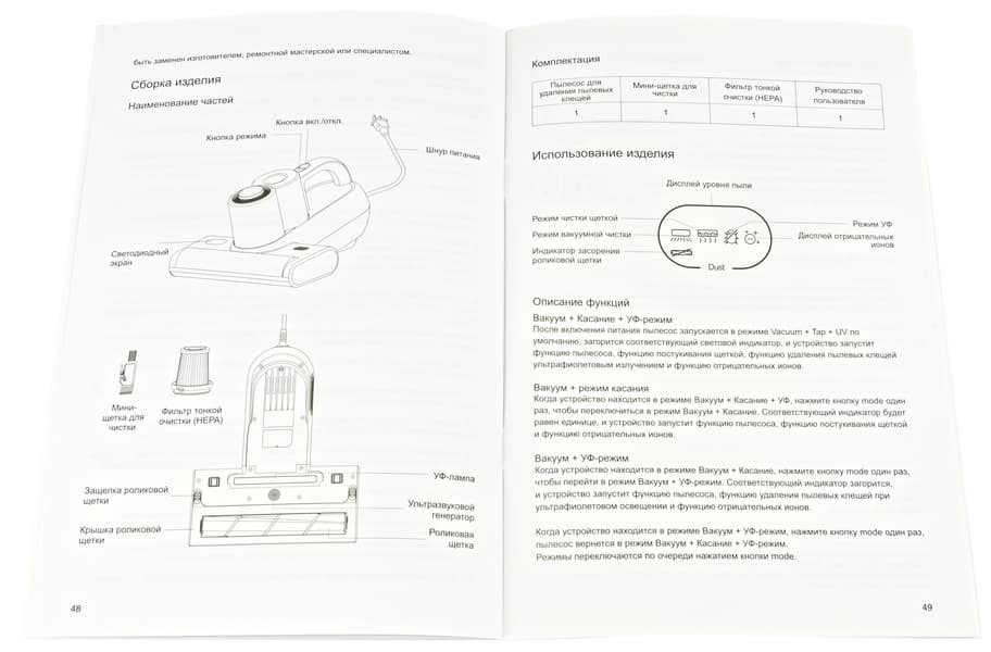 По умолчанию пылесос включает всасывание, чистку поверхности электрощеткой, обработку ультрафиолетом и ионизацию. Первое нажатие на кнопку «Mode» отключает УФ-облучение, второе останавливает электрощетку, включая ультрафиолет. Функция ионизации и всасывание активны постоянно.