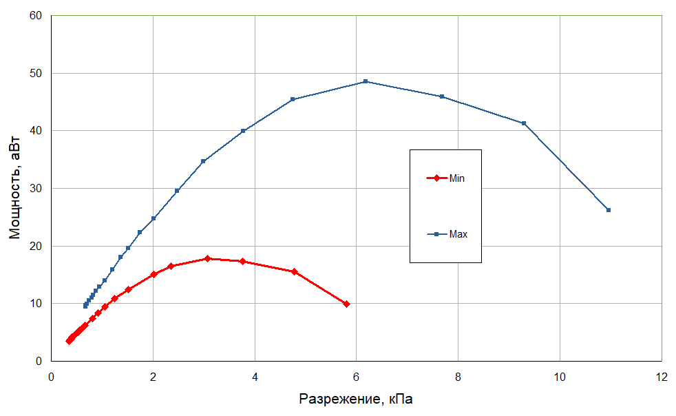 Измеренная нами мощность всасывания составила 48,5 аВт в максимальном режиме и 17,8 аВт в минимальном.