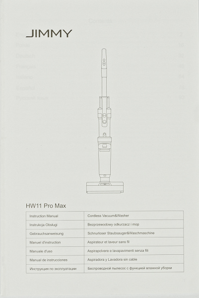 Русскоязычная часть документа занимает 17 страниц со множеством иллюстраций. На них подробно описывается конструкция Jimmy HW11 Pro Max, его сборка, подготовка к работе, управление устройством и его эксплуатация. Документ дает советы по уходу за пылесосом, а также содержит список возможных неисправностей с методами их самостоятельного устранения.