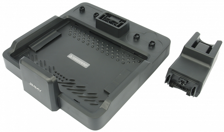 Для обслуживания и зарядки предназначена базовая станция из черного пластика. В передней части ее плоского поддона есть углубление, где при самоочистке промываются оба ротора напольной насадки. Внутри корпуса установлен вентилятор для сушки щеток. Теплый воздух подается на них в течение нескольких часов после промывки — это исключает появление неприятных запахов и препятствует размножению вредной микрофлоры на велюровых элементах.