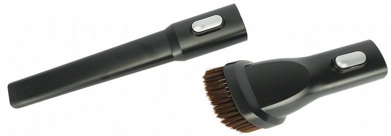 Щелевое сопло служит для чистки труднодоступных мест, а широкая щетка с мягкой щетиной подходит для ухода за одеждой.