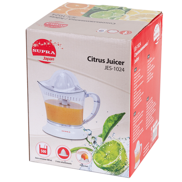 Выглядит модель так, как водится у Supra: никаких изысков, белый дешевый пластик, максимальная компактность. Прибор умеет выжимать сок из больших и маленьких цитрусовых фруктов — для лимонов и лаймов у него есть специальная насадка.