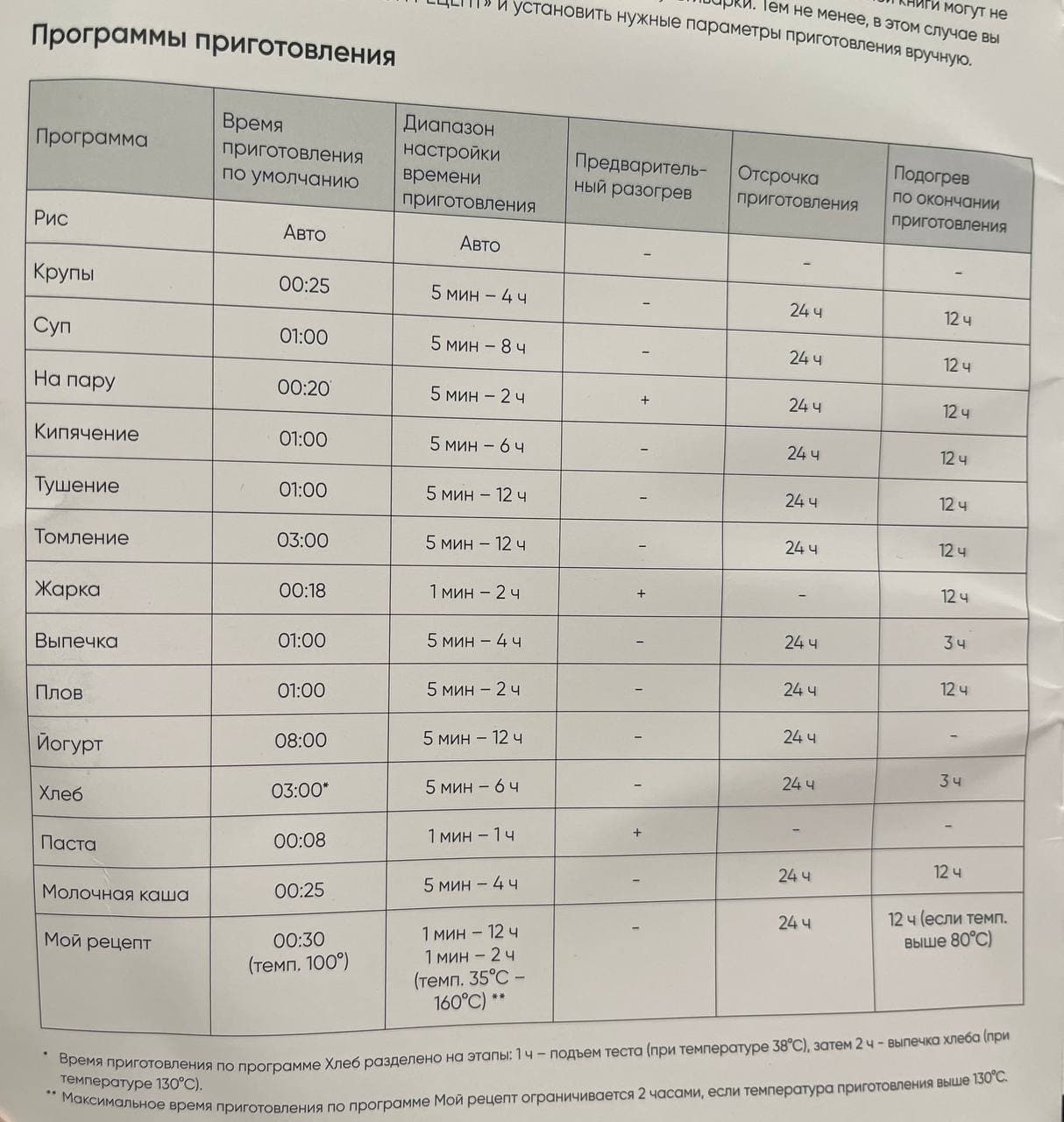 В комплекте также имеется книга рецептов, которая включает в себя 26 страниц и 73 рецепта, также там можно найти таблицу с подробным описанием программ приготовления и возможности установки в них отложенного старта и срабатывания автоподогрева.