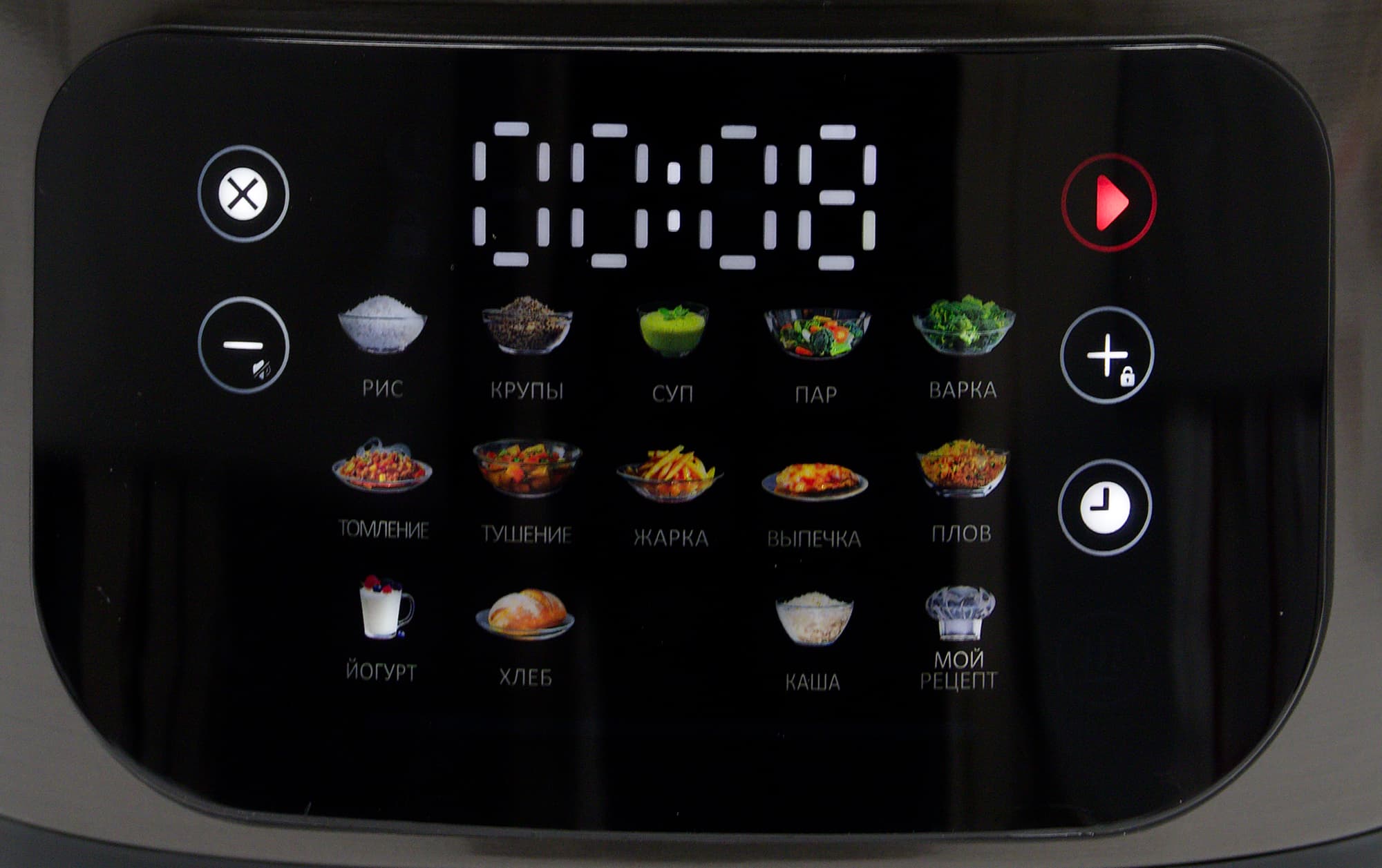 Теперь перечислим кнопки выбора автоматических программ: рис, крупы, суп, на пару́, кипячение/варка, тушение, томление, жарка, выпечка, плов, йогурт, хлеб, паста, молочная каша.