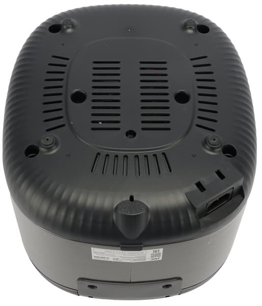 На дне прибора расположены вентиляционные отверстия. По углам находятся маленькие прорезиненные ножки, а сзади еще одна ножка покрупнее, все вместе они обеспечивают устойчивость и препятствуют скольжению устройства по поверхности.