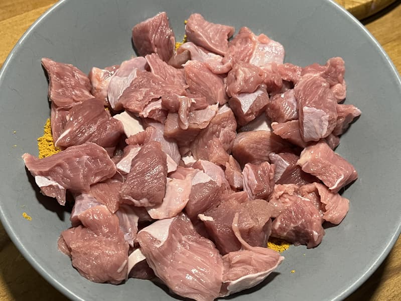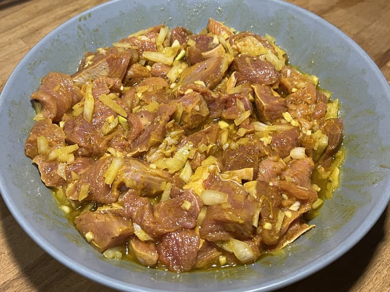 Для начала подготовили филе бедра индейки: нарезали его на небольшие кусочки, добавили карри, подсолнечное масло, мелко нарезанный лук и чеснок. После чего отправили мариноваться на всю ночь, чтобы при тушении мясо получилось мягким, а не резиновым.