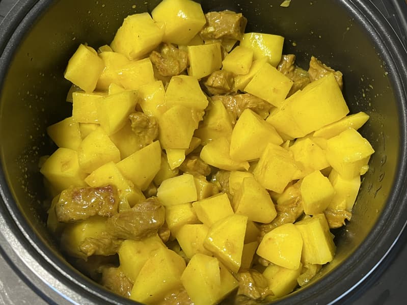 Добавили еще немного карри, паприки, черного молотого перца, сушенного укропа, красного острого перца, тимьяна, майорана, кинзы, чабера и соли. Хорошенько всё перемешали и оставили мультиварку в покое.