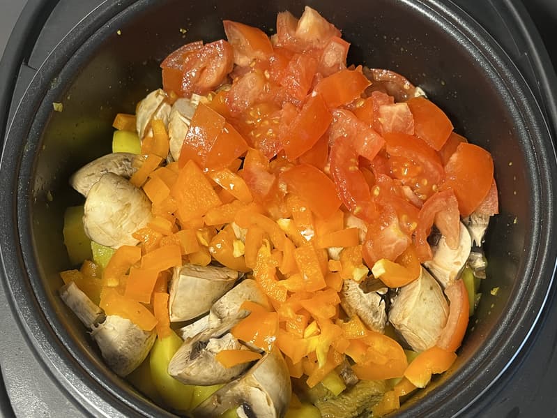 Затем установили режим «Тушение» на 1 час, нарезали овощи и грибы и постепенно добавляли их в чашу.