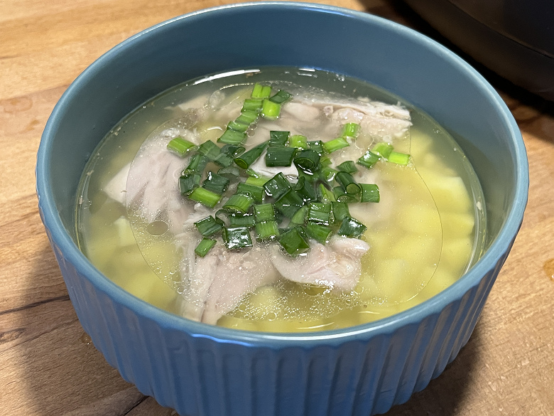 Чтобы проверить, насколько тщательно прибор контролирует процесс закипания, мы решили приготовить куриный суп. Одна из основных ценностей хорошей мультиварки — отсутствие длительного кипения при варке бульона (и к тому же необходимости следить за процессом), благодаря чему пена не образуется и он получается прозрачным.