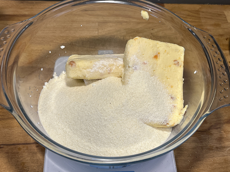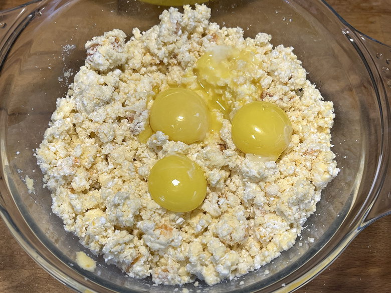К творогу и творожной массе добавили щепотку соли, манку, разрыхлитель. Разбили до мелких комочков, добавили желтки, сметану, ванильный сахар и тщательно всё перемешали. Оставили полученную массу на 20 минут, чтобы манка набухла.