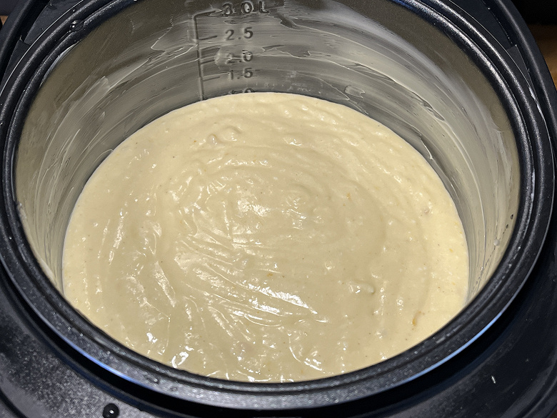 После чего переложили полученную массу в чашу, установили чашу в мультиварку и запустили режим выпечки на 1,5 часа.