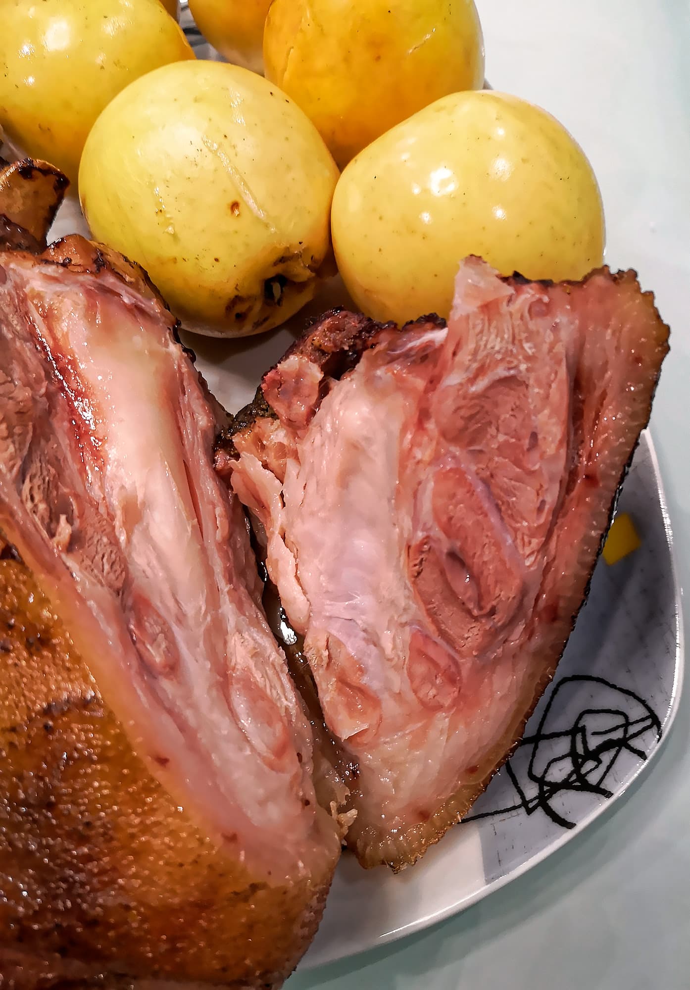 Сняли с гриля и дали полежать — мясо рульки оказалось нежным, шкурка и все хрящики и сухожилия коллагенизировались и стали нежными, как холодец. Но больше всего нам понравились яблоки: они остались целыми, лишь немного потрескавшись снаружи, и приобрели необычайно деликатную структуру: такими бывают яблоки внутри новогоднего гуся.