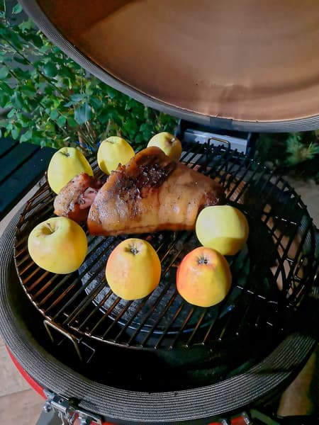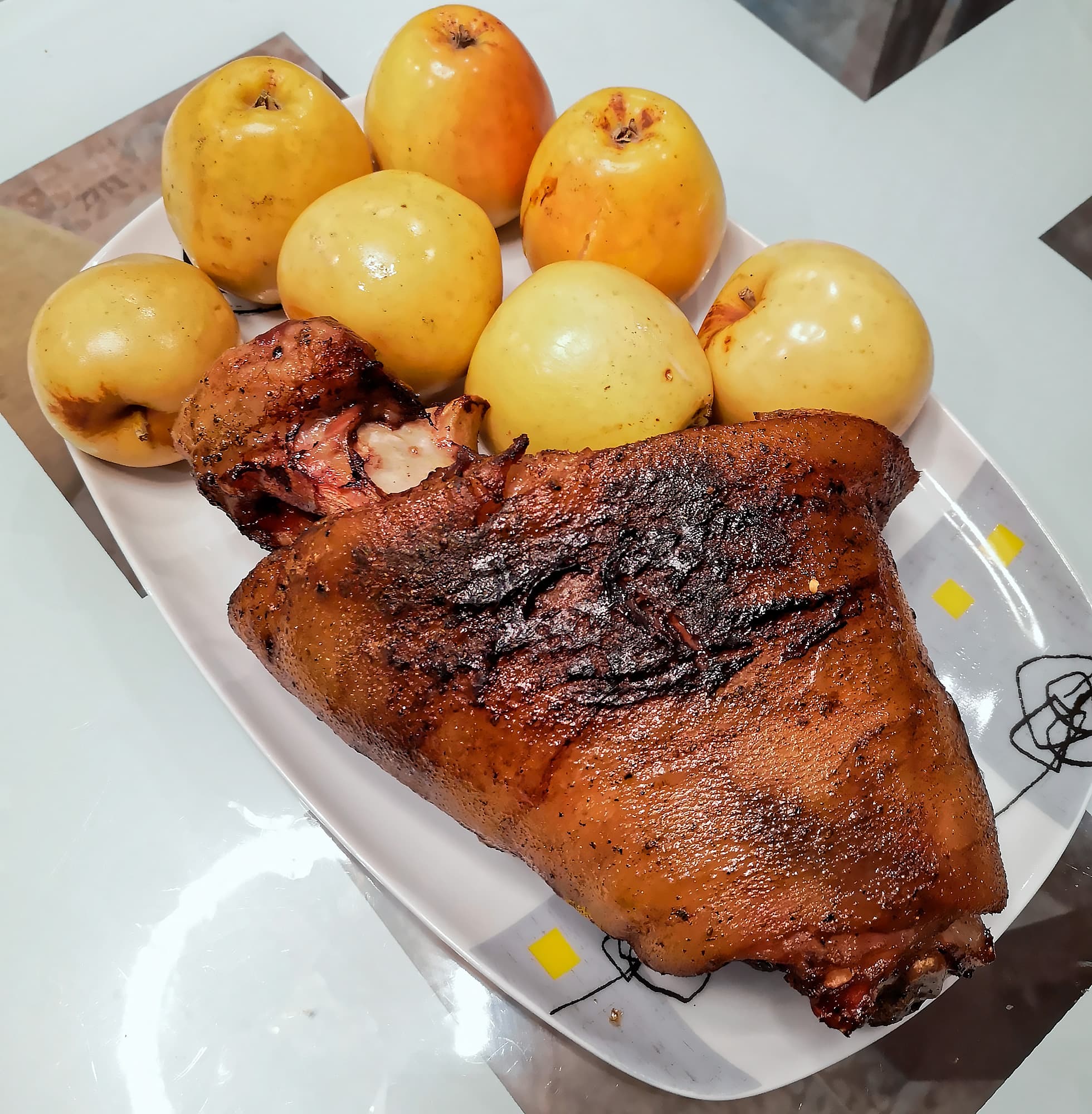 На последние два часа обложили рульку яблоками.