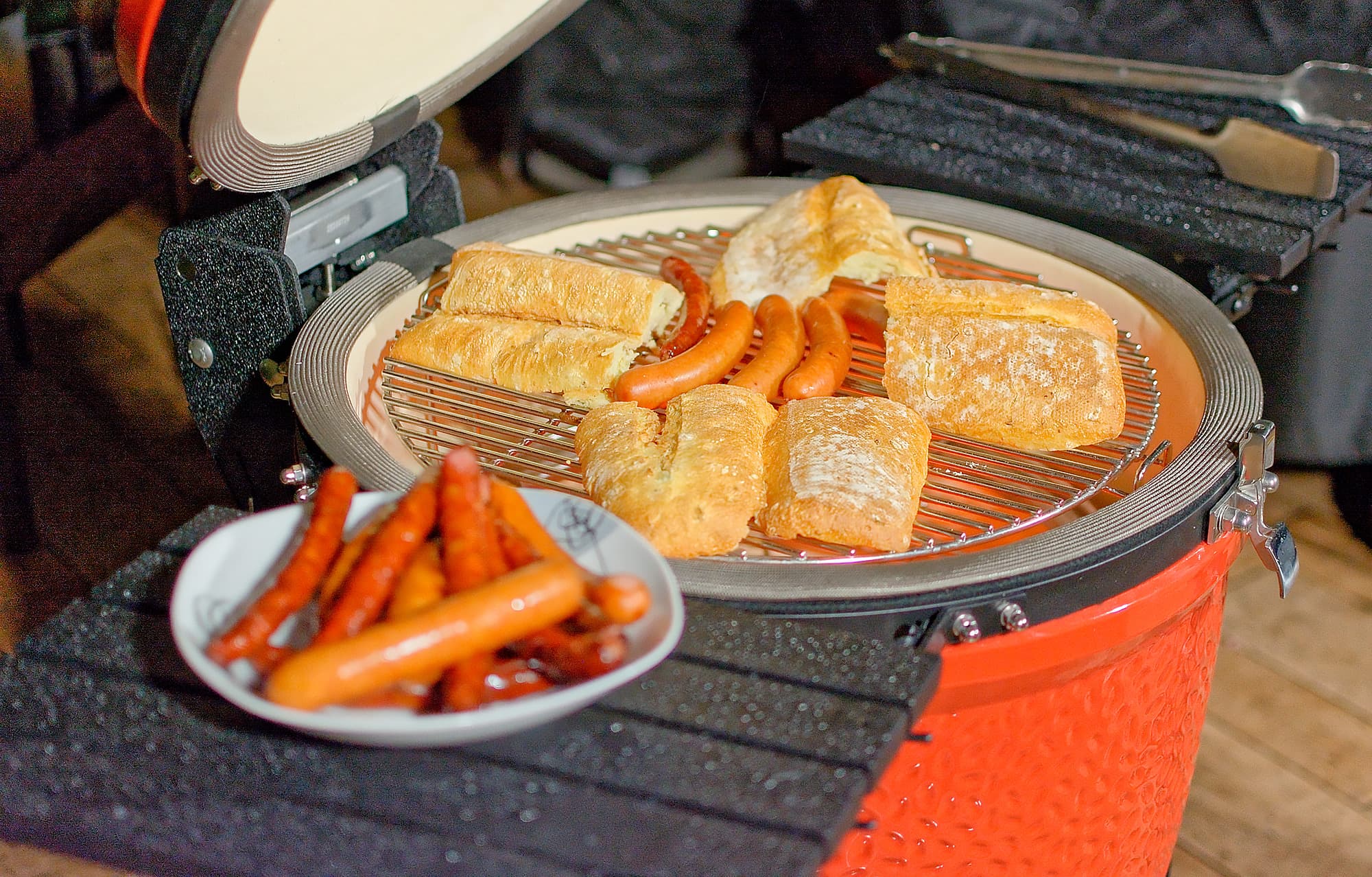 Сначала — знакомство с грилем. Аппарат, что тут скрывать, впечатляющий. Так что мы начнем с простого и беспроигрышного фастфуда: приготовим хот-доги. Заодно и немного освоимся с Kamado Joe Classic III.