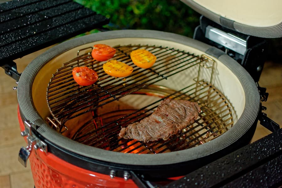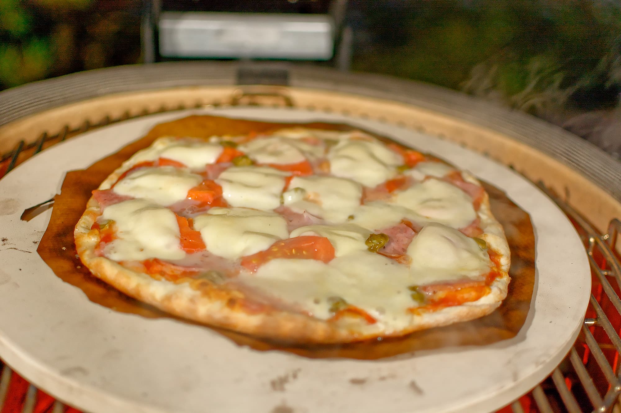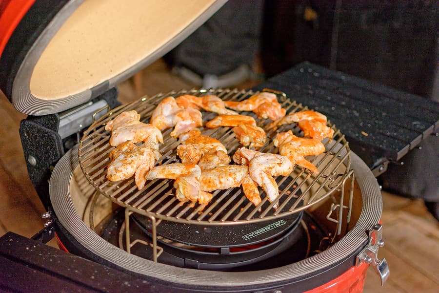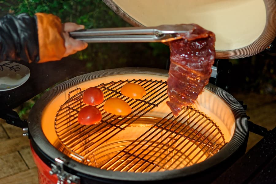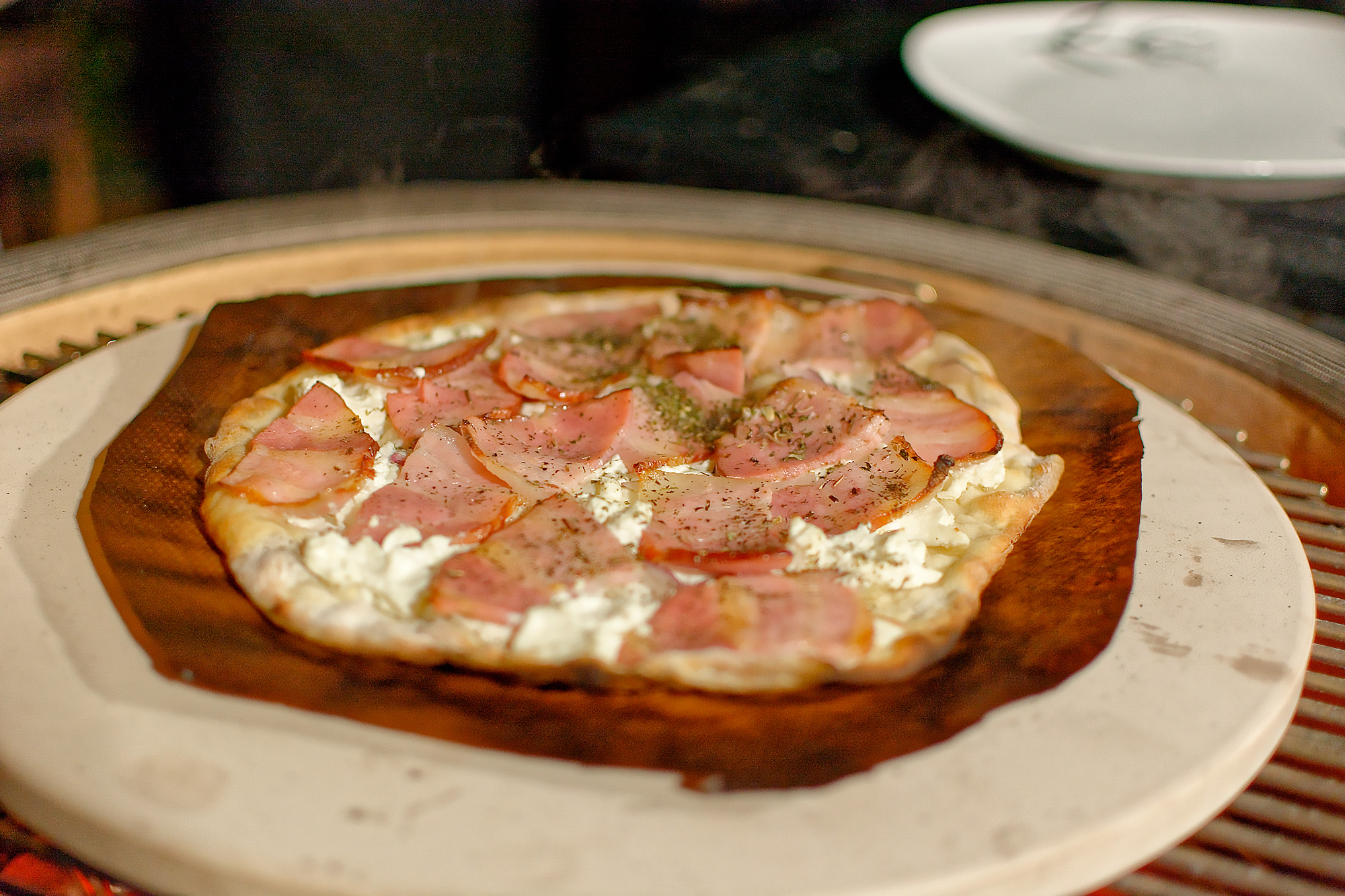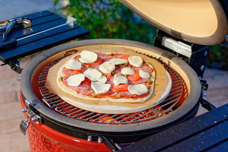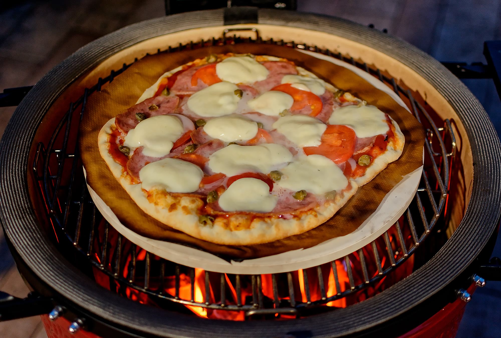 Мы готовили блюда и на прямом жаре, то есть над углями, используя регулировку решеток по высоте и возможности засыпать как полную, так и половинную порцию углей, и с помощью жароотсекателя на средних и низких температурах, а также использовали фирменный камень для пиццы, «разогнав» Kamado Joe Classic III до впечатляющих температур под крышкой.