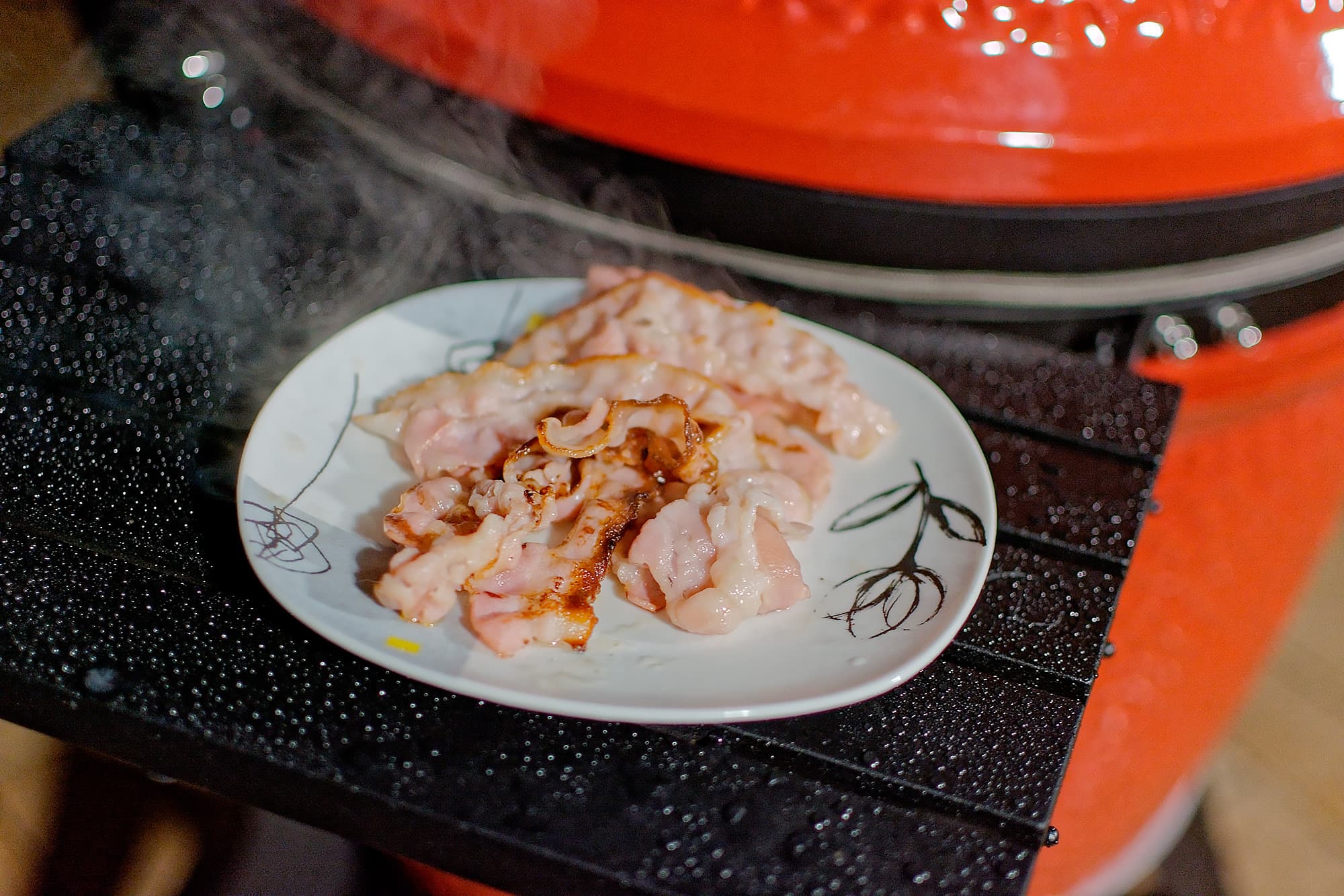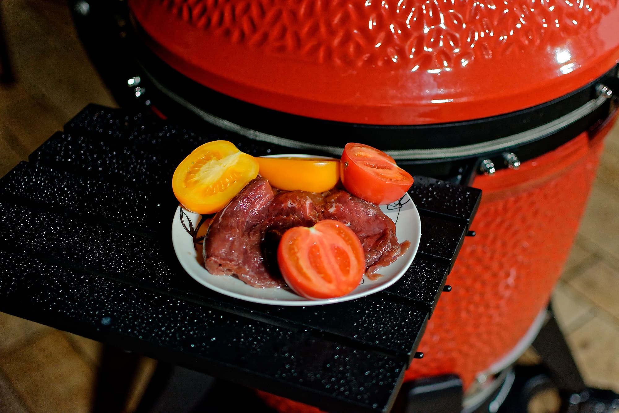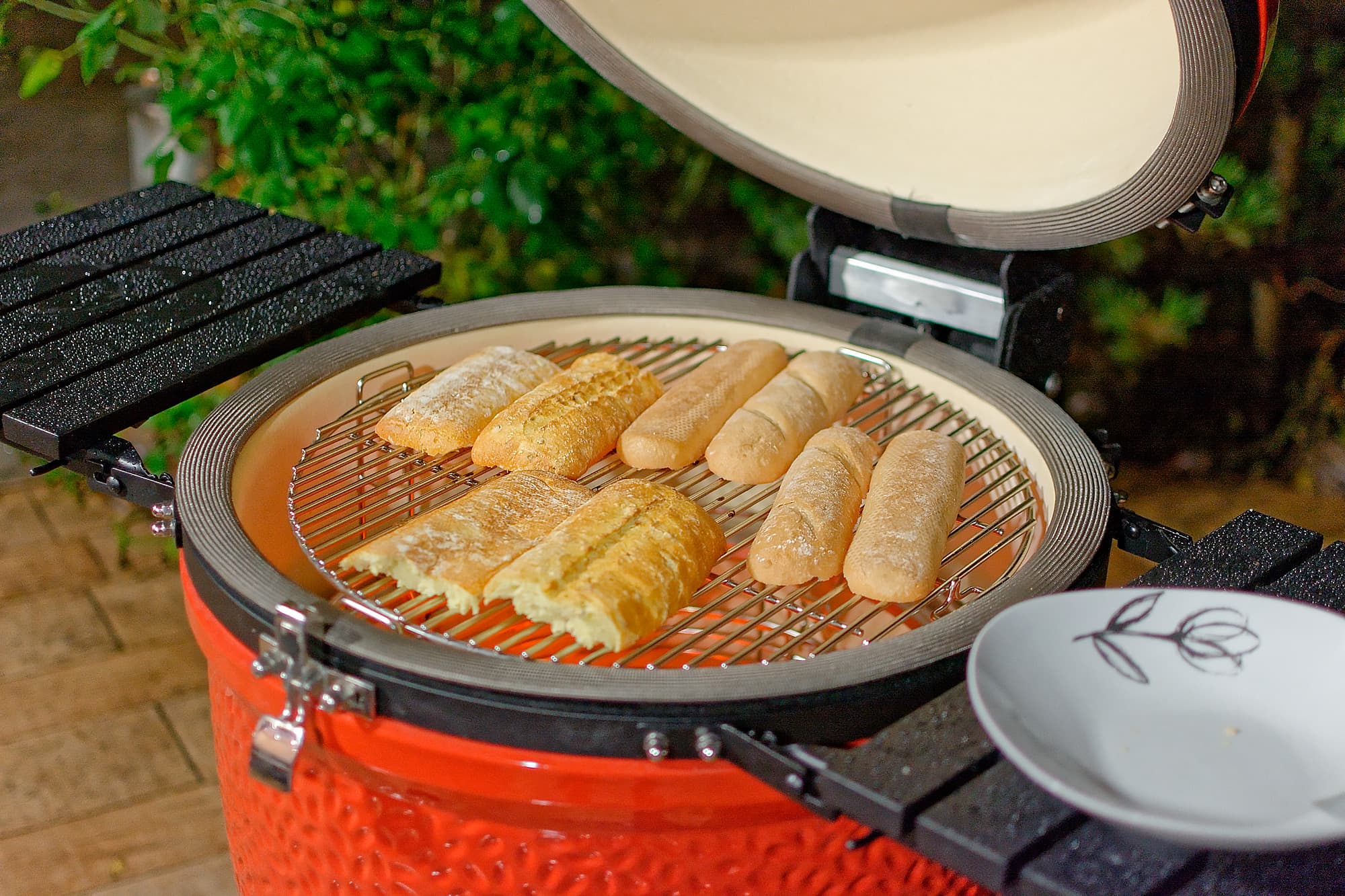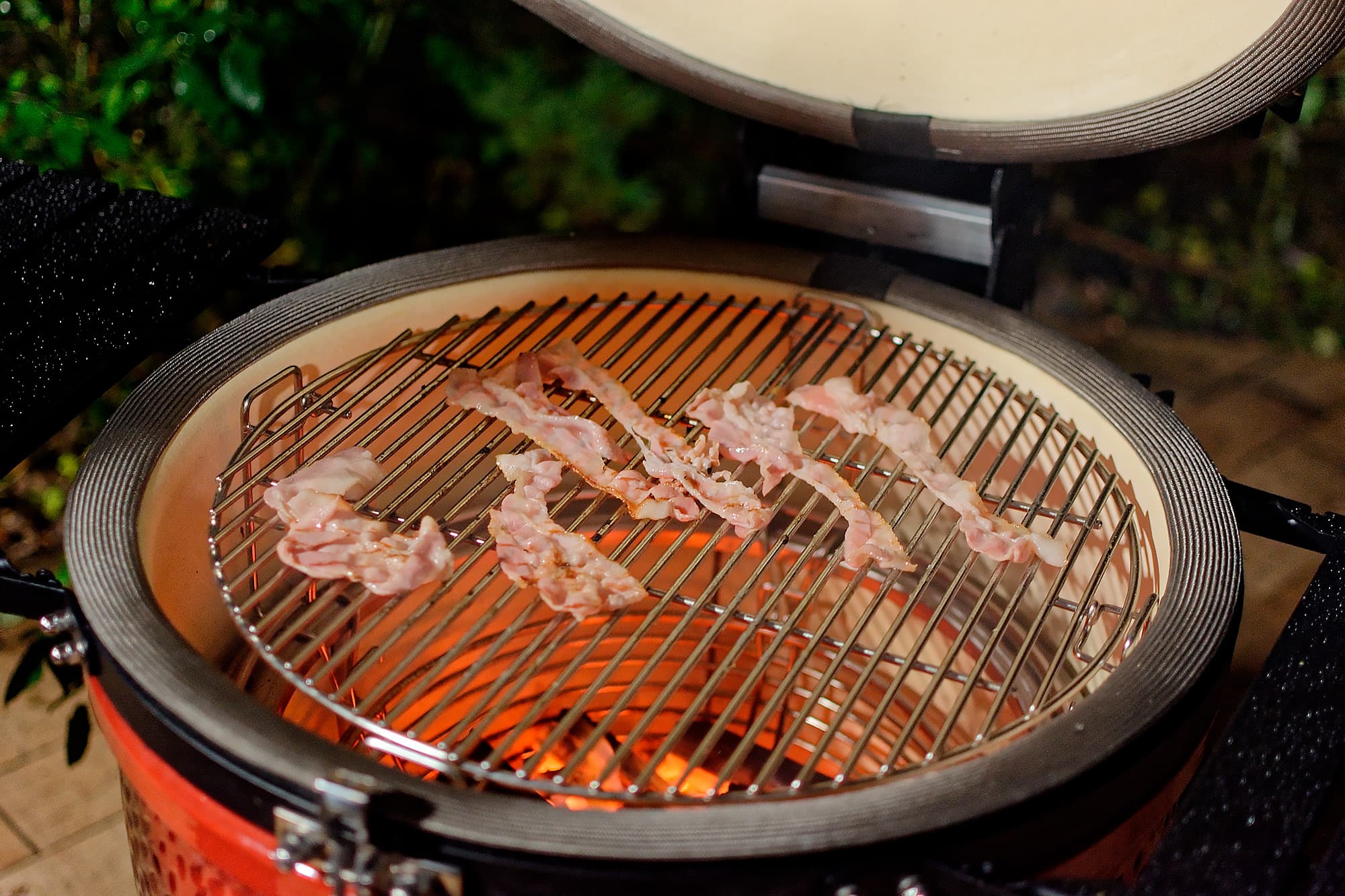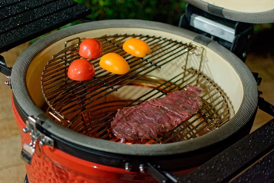 Мы готовили блюда и на прямом жаре, то есть над углями, используя регулировку решеток по высоте и возможности засыпать как полную, так и половинную порцию углей, и с помощью жароотсекателя на средних и низких температурах, а также использовали фирменный камень для пиццы, «разогнав» Kamado Joe Classic III до впечатляющих температур под крышкой.