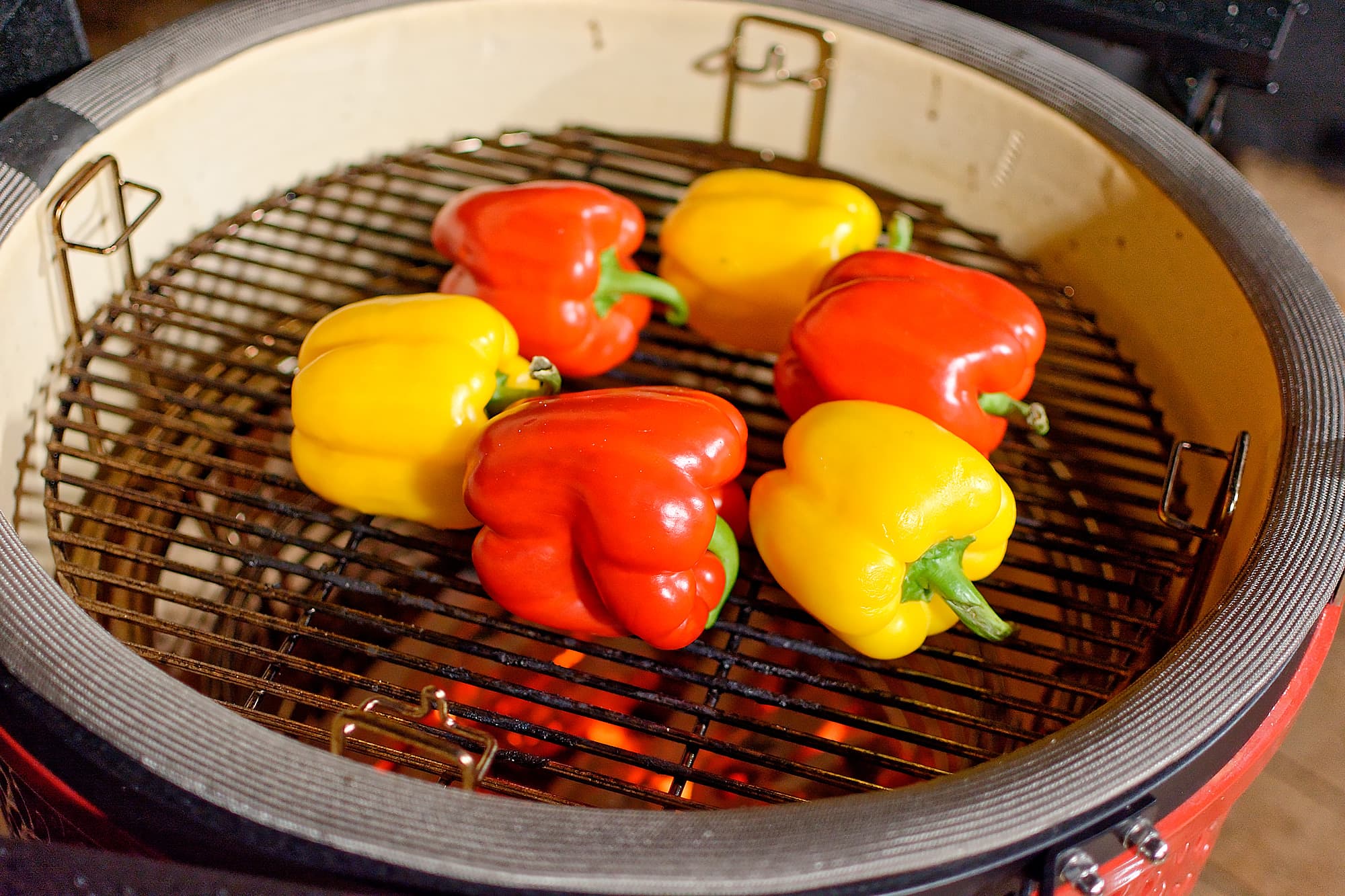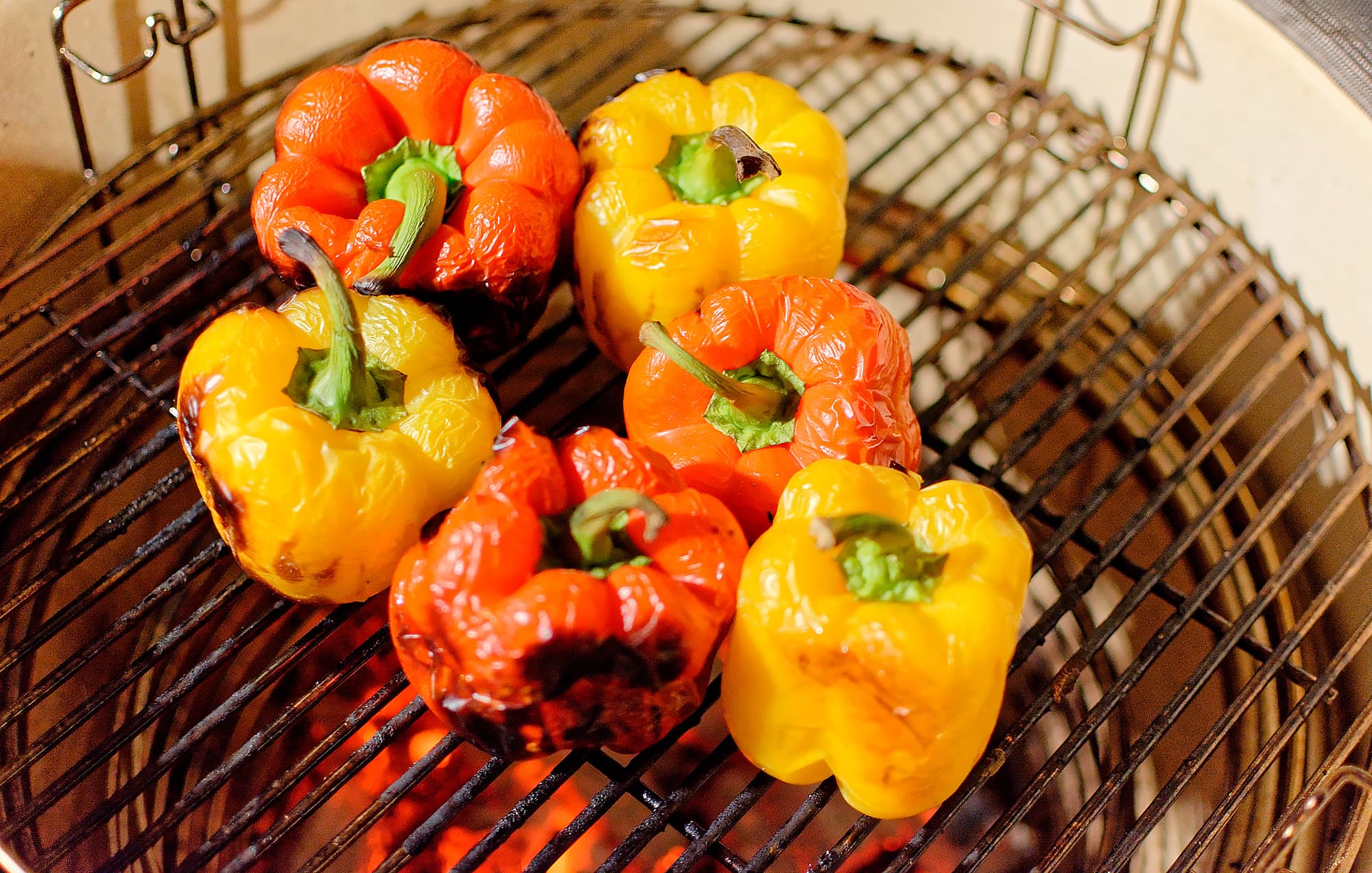 Желтые и красные перцы мы положили на решетку гриля и накрыли крышкой.