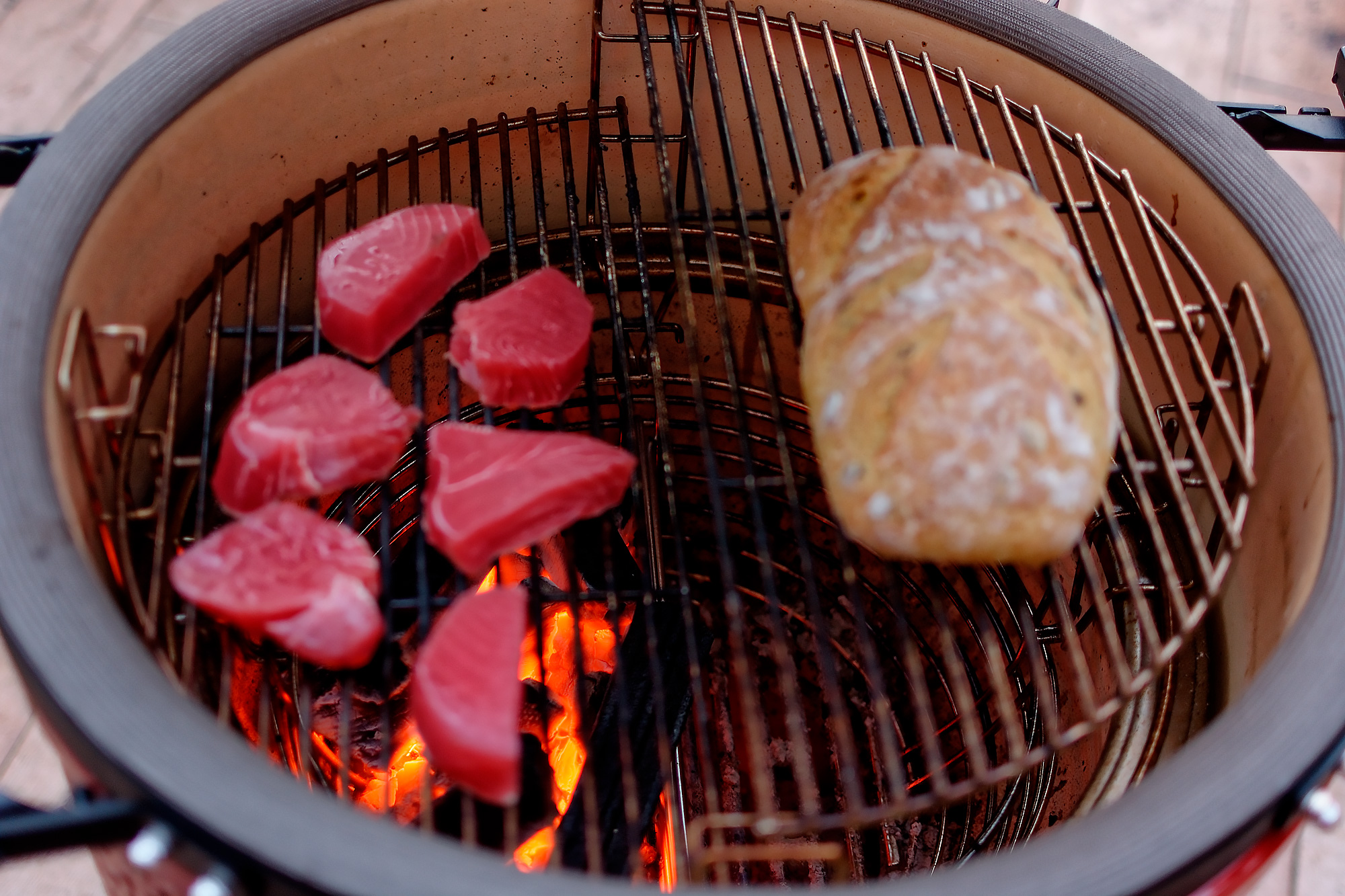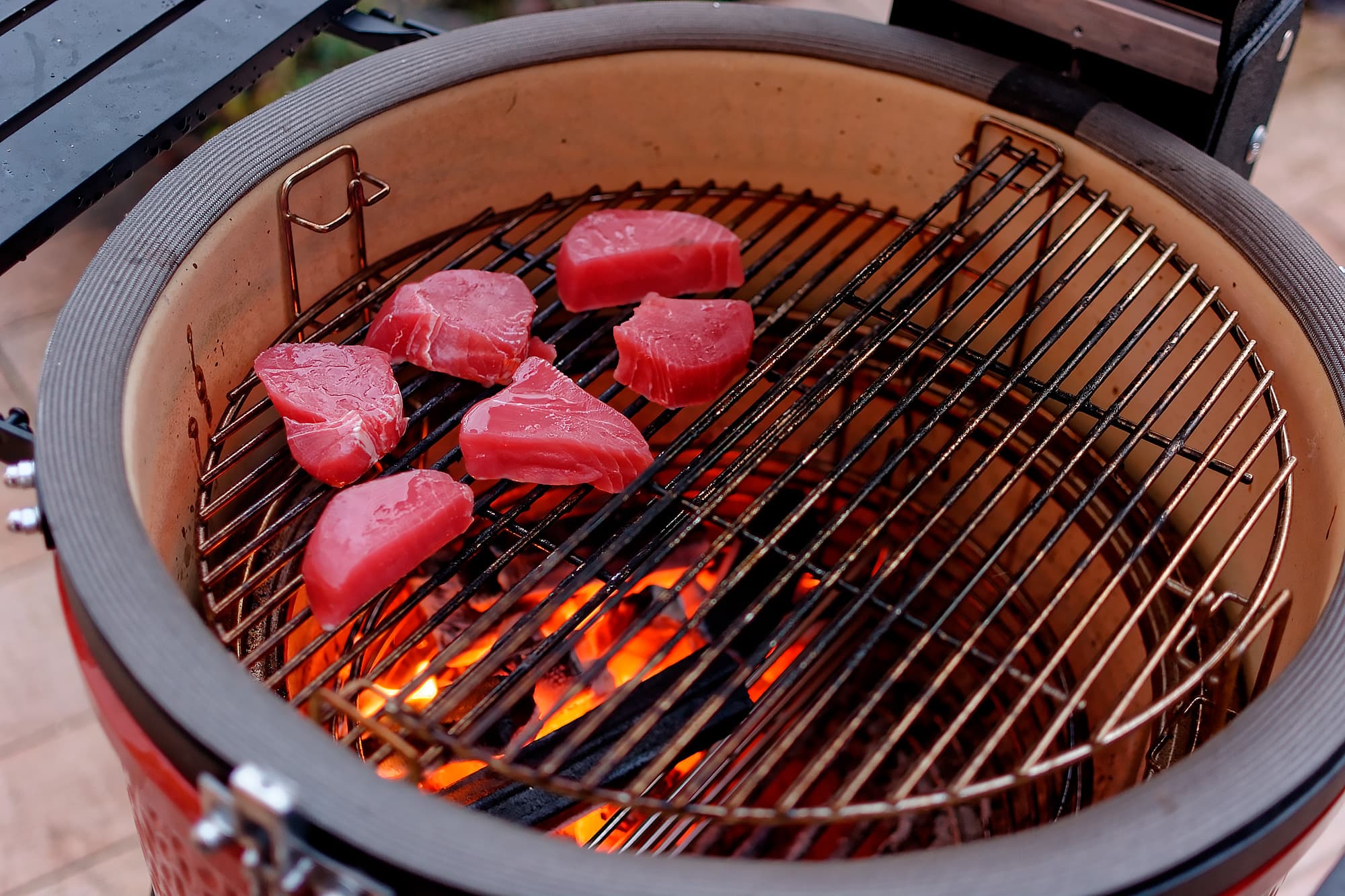 Используем наш Kamado Joe Classic III с половинной загрузкой. У нас была упаковка в 700 граммов тунца, и мы решили поставить разделитель и обжарить рыбу над одной из половинок гриля.