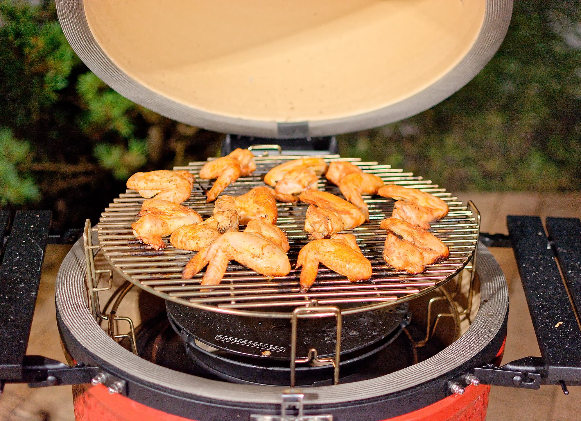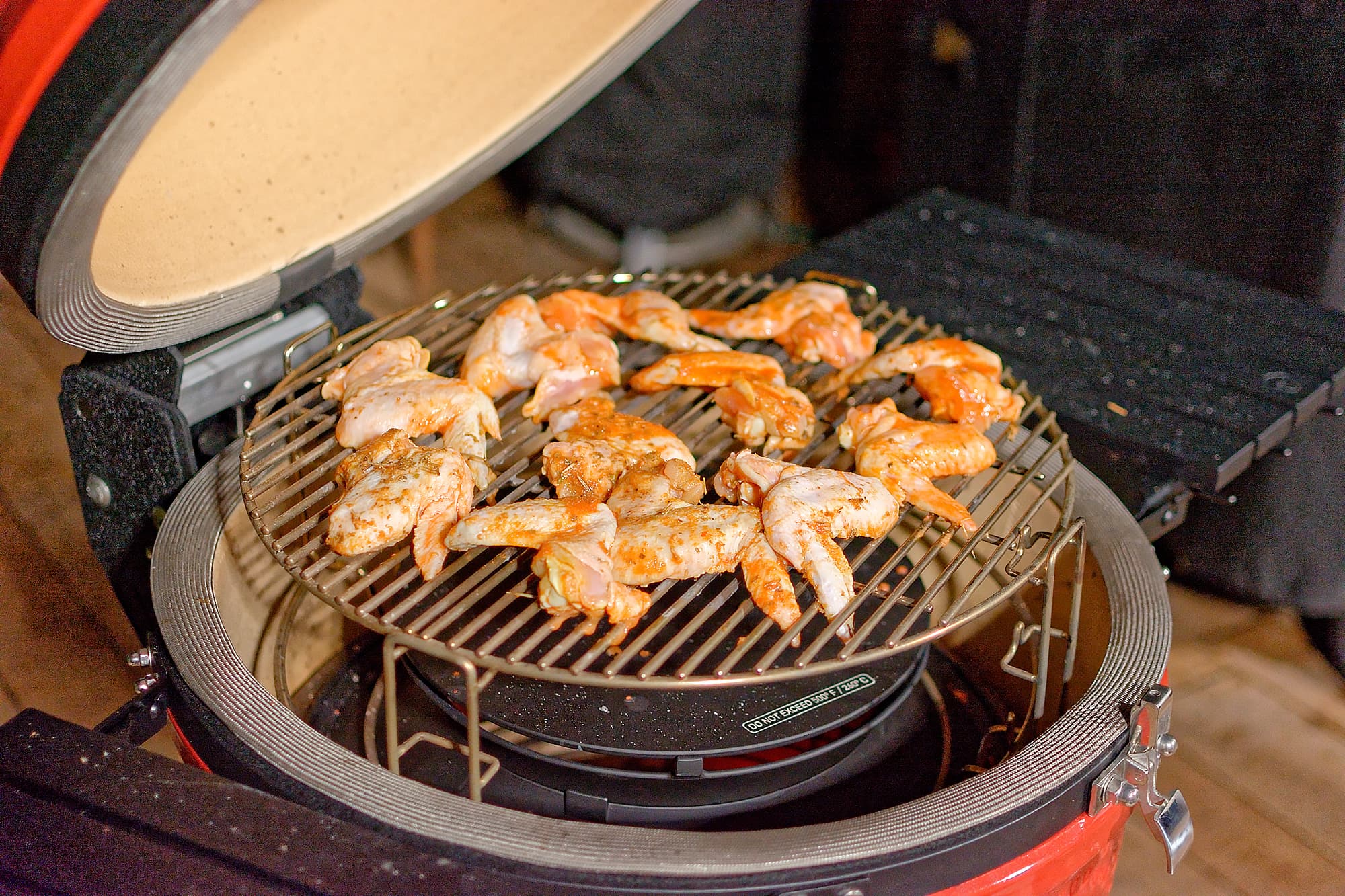 Для начала замариновали на ночь 1,5 кг куриных крыльев в томатном соке с парой ложек оливкового масла и смесью прованских трав. Установили систему и сверху решетку, разложили крылышки и накрыли крышкой.