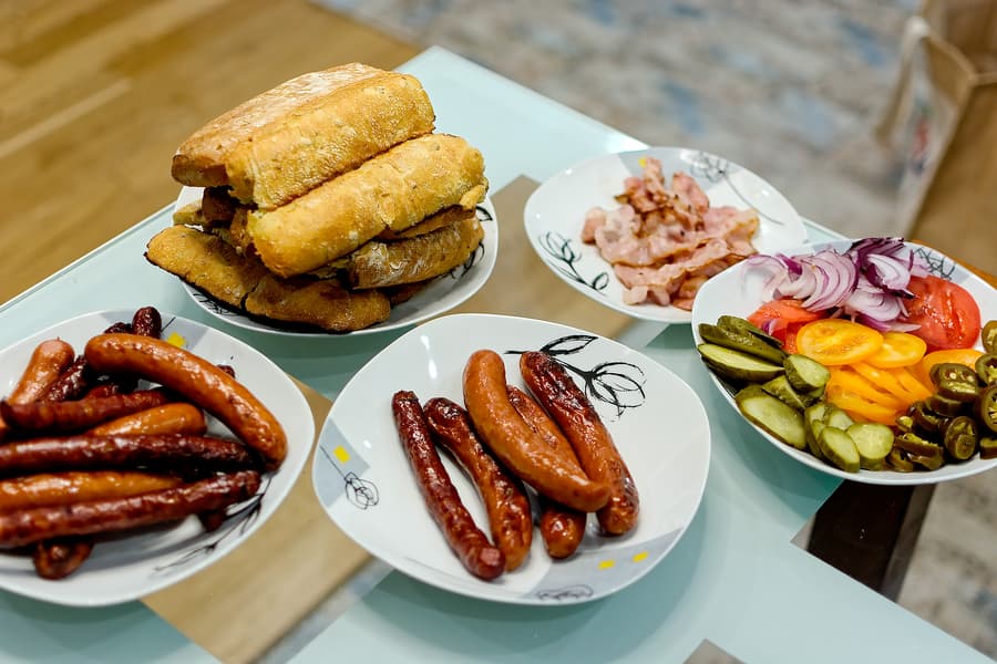 Помимо колбасок, хлеба и бекона, мы использовали для начинки хот-догов свежие помидоры, маринованные огурцы, красный крымский лук, перец халапеньо, сладкую горчицу, кетчуп и майонез: каждому едоку по желанию.
