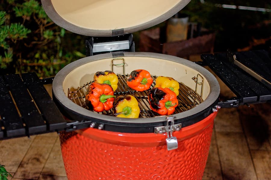 Сняв с решетки перцы и уложив их в большую миску, накрываем последнюю тарелкой так, чтобы получилось более или менее герметично и кожица «отпотела». Тем временем поглядываем на «камадовские» угли: за время этого и предыдущих тестов они чуть подернулись пеплом и горят еще очень горячо.