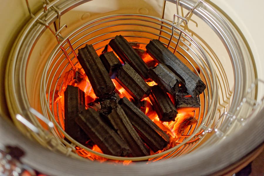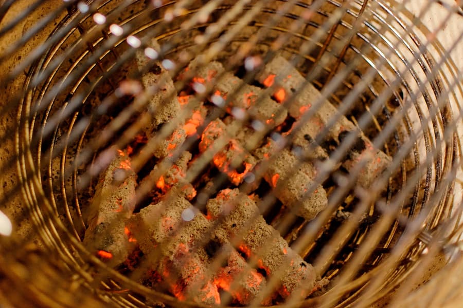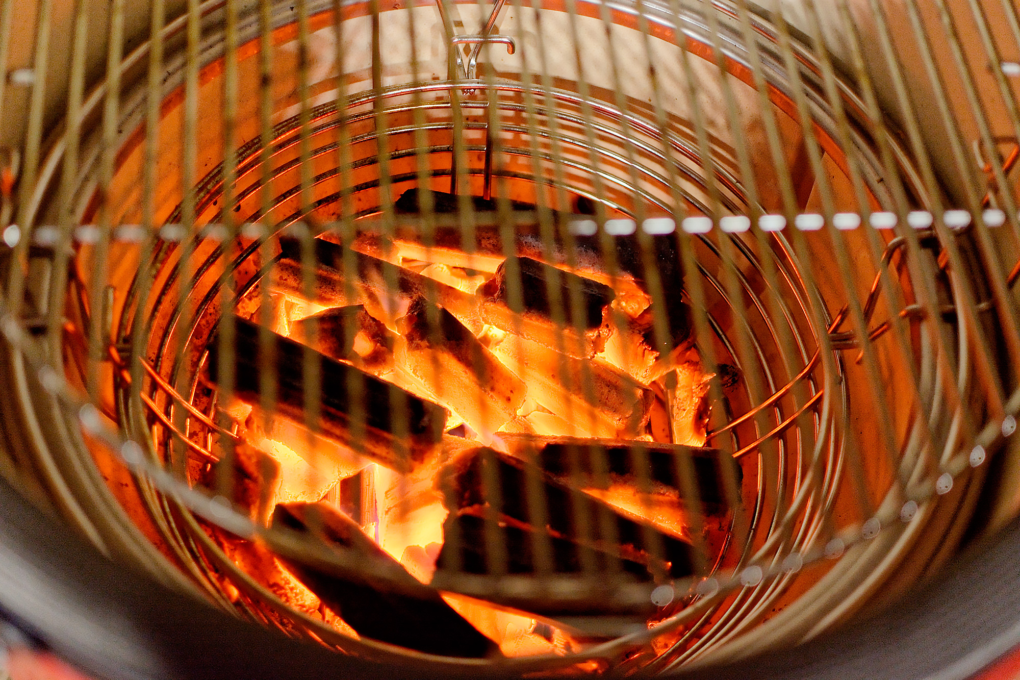 Уже имея проверенный «читерский» способ, фирменные камадовские долгоиграющие и высокожаркие «трубчатые» угли мы разжигали с помощью обычных: разводили их в стартере, высыпали в гриль, а потом сверху клали «трубочки». Очень быстро и эффективно.