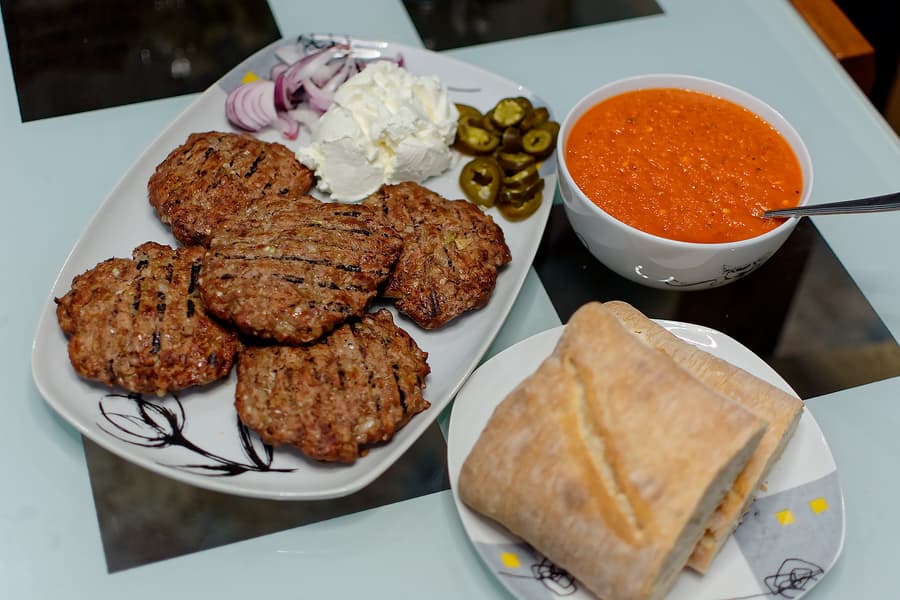 Плескавицу подали с айваром, луком и халапеньо, мягким сербским сыром каймаком, а также хлебом. Будем повторять!