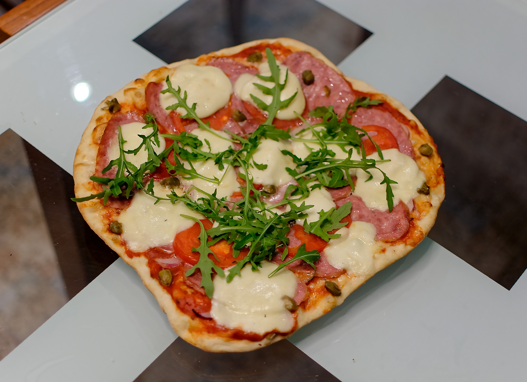 И начали метать пиццу за пиццей. Для первых использовали соус на основе томатов с травами, салями, лук, свежие помидоры, моцареллу и немного каперсов. Для легкого переноса с формовочной доски на раскаленный камень использовали пекарскую бумагу — остались довольны, но если уважаемые читатели подскажут еще идеи — будем рады видеть их в комментариях и обязательно опробуем в будущих тестах.