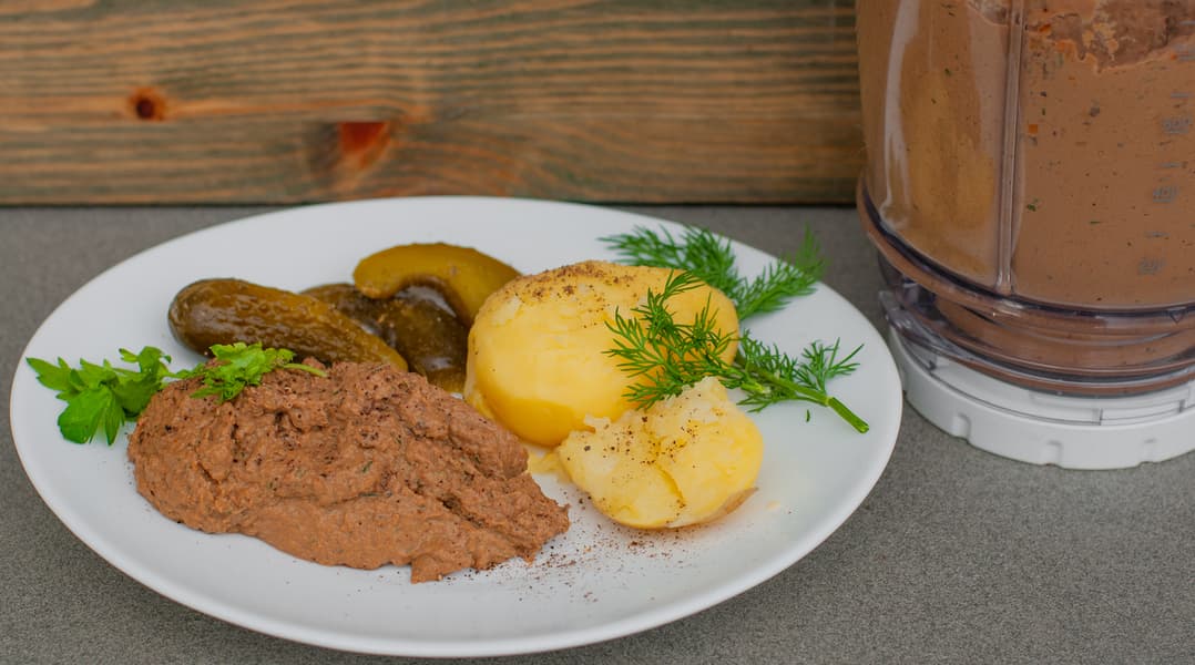 Периодически добавляли еще кусочки печени и перемешивали смесь ложкой, так как ножи не всегда могли захватить кусочки. Продолжали процесс около 15-20 минут: 5-7 секунд работы блендера, после остановка и домешивание ложкой. Несмотря на то, что процесс был немного более трудоемок, чем хотелось, результат порадовал. Паштет получился достаточно однородным, мелкоизмельченным.
