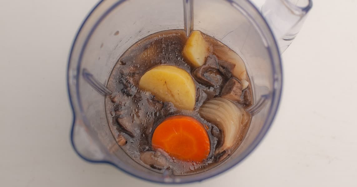 Мы приготовили грибной суп из замороженных лесных грибов, моркови, лука и картошки. Остудили, переложили в чашу блендера.