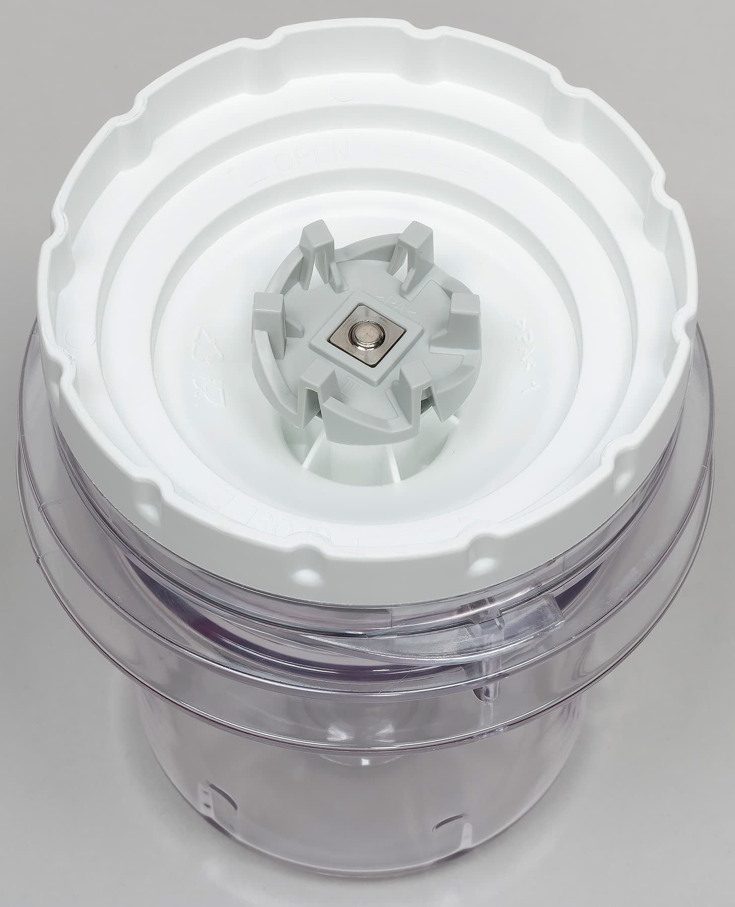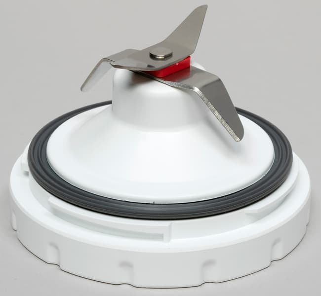 Снизу на измельчитель через уплотнительное кольцо накручивается ножевой блок. Ножевой блок пластиковый, ножи из нержавеющей стали, загнуты в разные стороны, не острые. Между ножами стоит пластиковая прокладка.