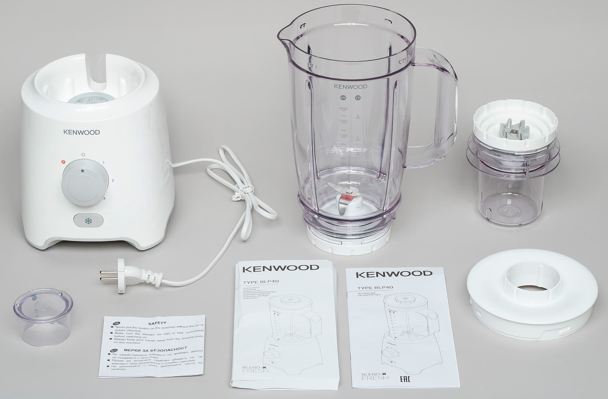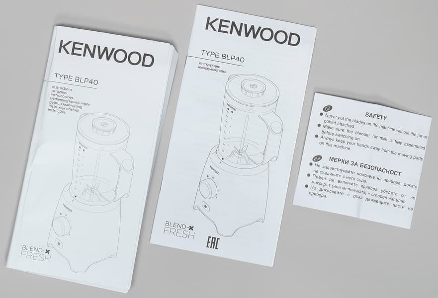 В комплекте к блендеру мы получили две книжки с инструкциями и лист с мерами безопасности. Одна из инструкций — увесистая книжечка — дублирует руководство на 19 языках, вторая, из 22 страниц, всего на двух — русском и казахском.