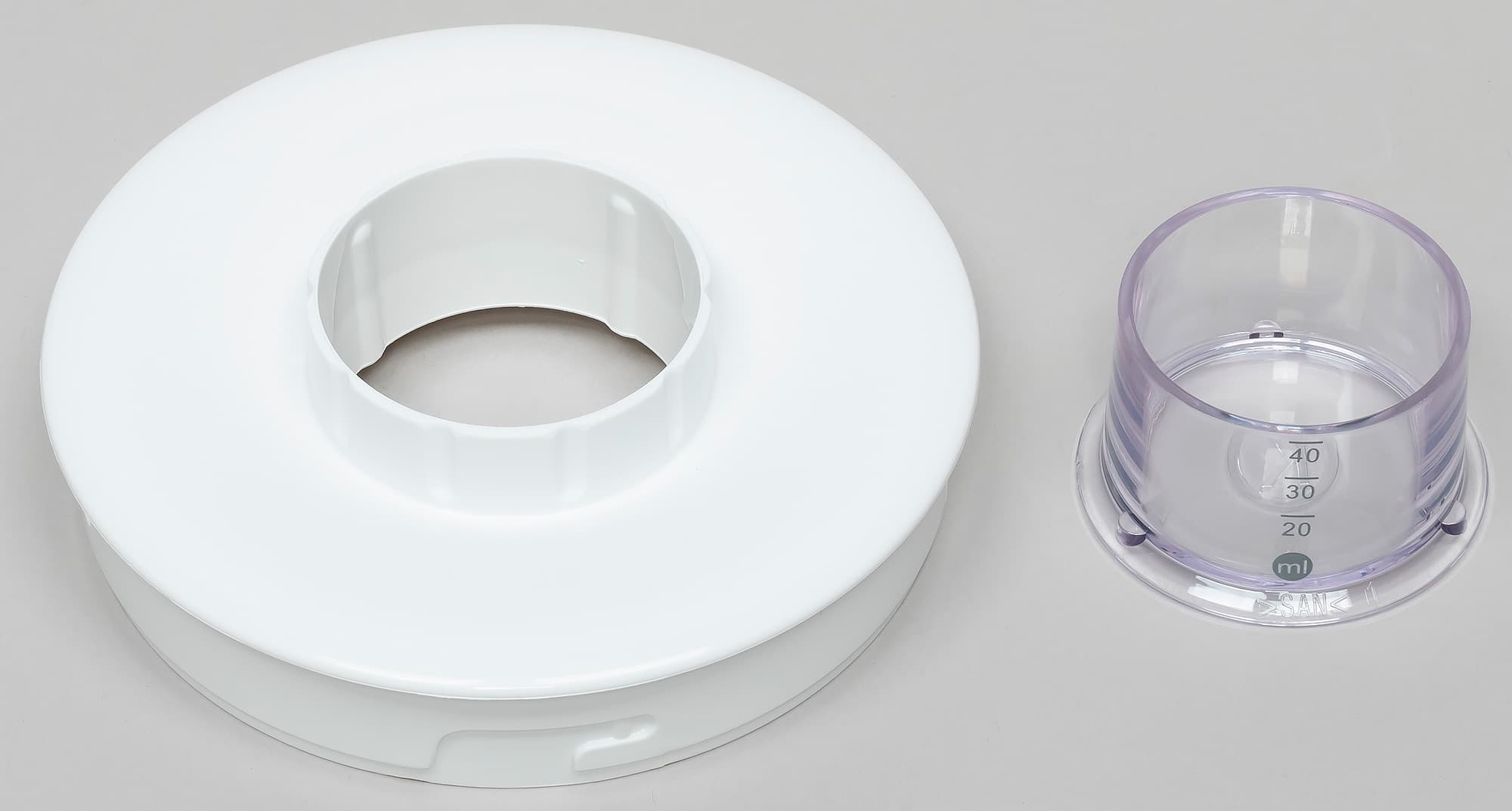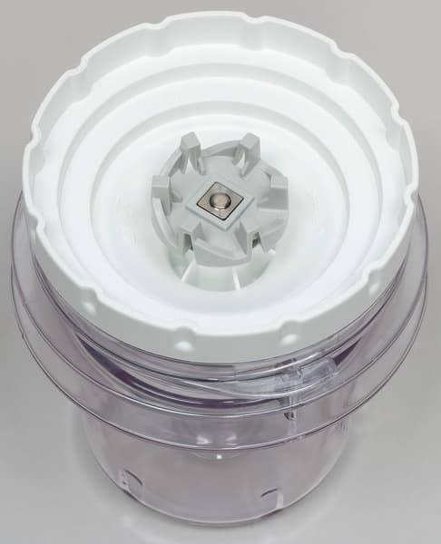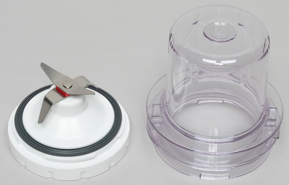Измельчитель сделан из прозрачного пластика и имеет объем 200 мл. Он устанавливается на моторный блок так же, как и основной кувшин.