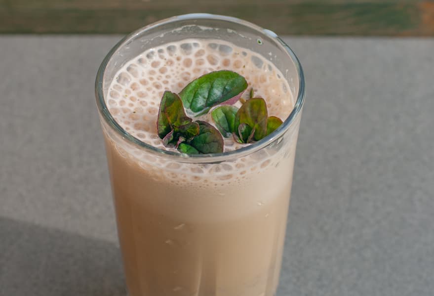 Мята порубилась хорошо, самые крупные кусочки получились размером с крупинки сахара, они осели на дно кувшина. В коктейле отчетливо заметна взбитая молочная пена.