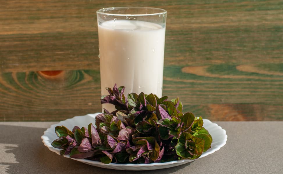 Для мятного коктейля мы взяли свежую мяту и молоко, положили в кувшин, измельчали на высокой скорости около 1 минуты.