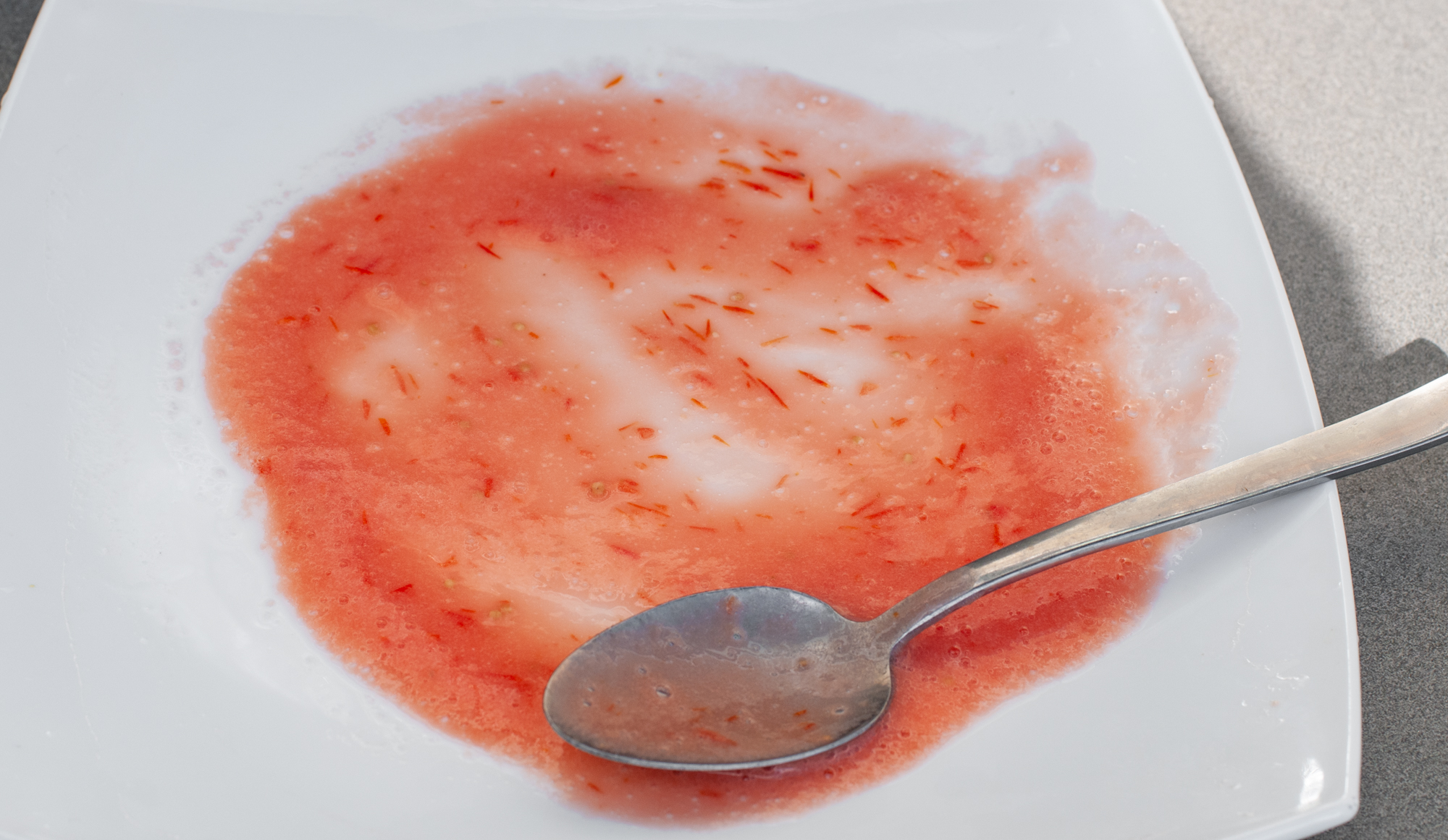 Измельчали на высокой скорости в течение 45 секунд. Результат выложили на тарелку для оценки. Масса получилась немного взбитая, с большим количеством крупных фрагментов шкурки и неперемолотых семечек.