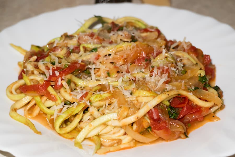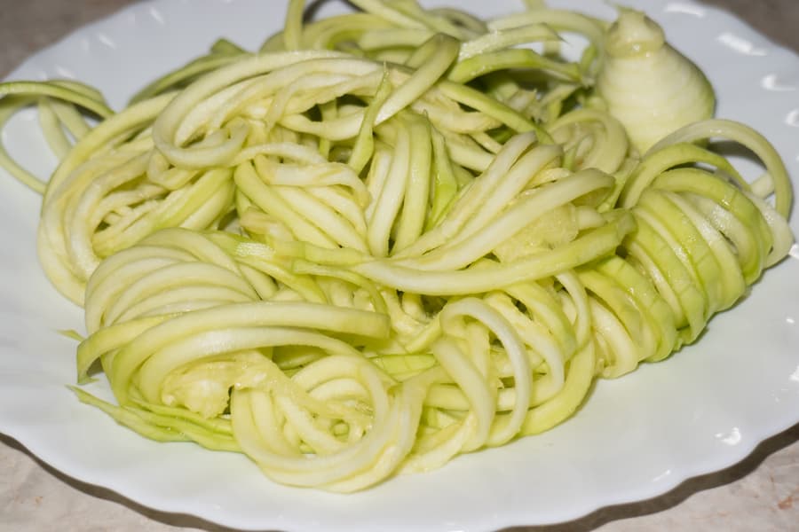 Одно из любимых приверженцами кетодиеты блюд — паста (лапша, спагетти) из цуккини. Этот овощ содержит мало углеводов, много клетчатки и считается подходящим для нежесткой кетодиеты. Чтобы придать цуккини форму спагетти, можно воспользоваться либо теркой для корейской моркови, либо насадкой для нарезания овощей соломкой в мультирезке (например Redmond FP606), кухонном комбайне (например, Bosch MUMS2EW40, Garlyn HB-330), кухонной машине (например, Polaris PKM 1206) или мясорубке с насадкой-овощерезкой (например, Red Solution RMG-M1250-8). Но в при использовании насадку для нарезания соломкой получится, скорее, вермишель из цуккини.