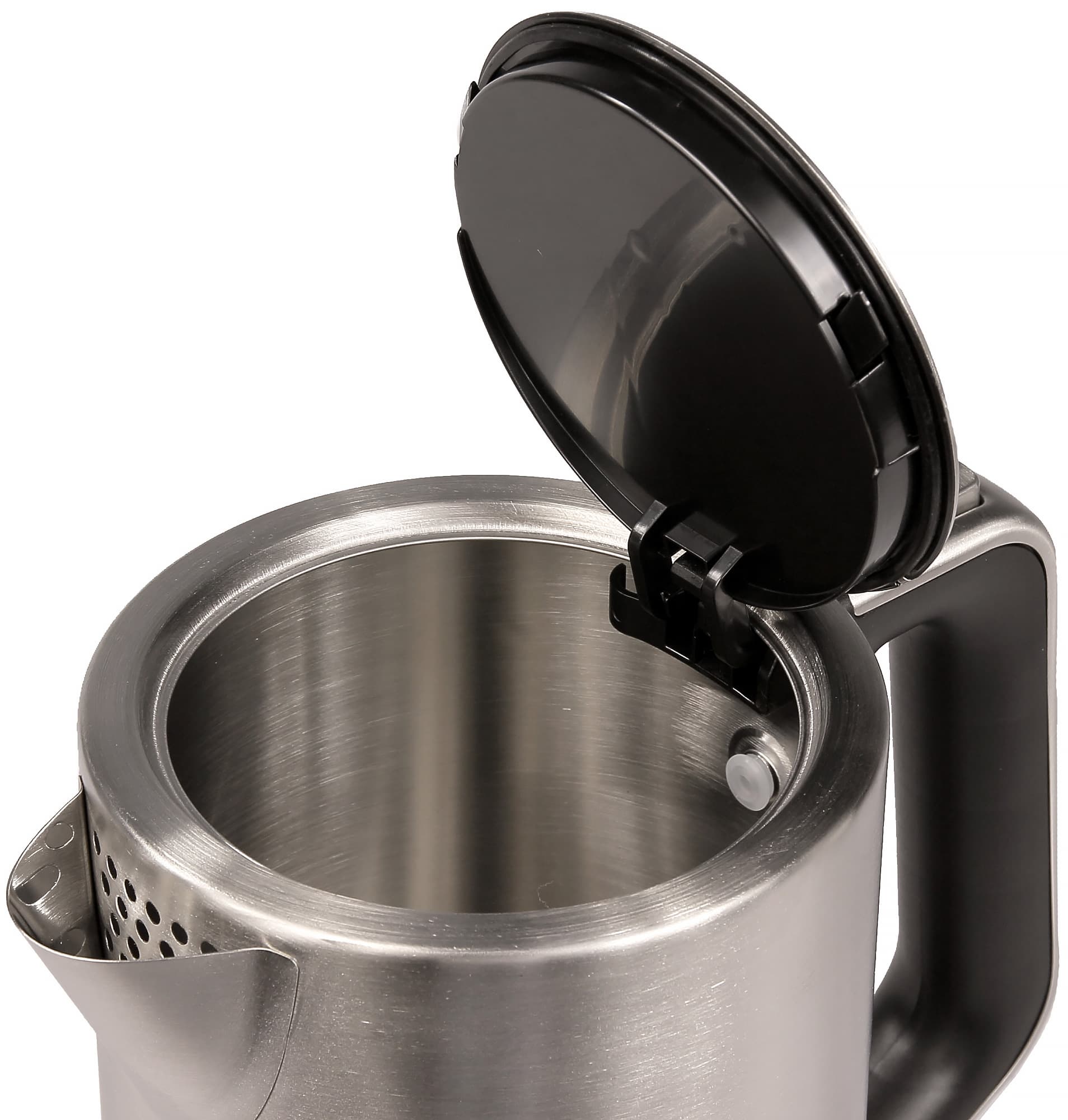 Основное требование к крышке чайника — чтобы в открытом состоянии она не мешала заливать в него воду. Например, у внешне весьма привлекательного Hotpoint Ariston WK 22M AR0 она этому требованию явно не соответствует: угол открытия слишком мал (поэтому еще раз: мы очень любим крышки, которые можно вообще снять).