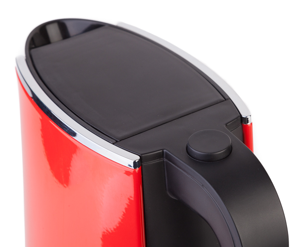 Сигналом о включении чайника служит яркая белая подсветка прозрачной вставки, являющейся индикатором уровня воды. Вот теперь мы смогли полностью оценить дизайнерскую задумку: черный низ и середина, красные бока — и светящаяся белая линия в центре. Впечатляет.